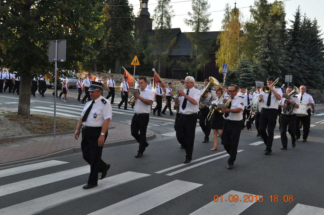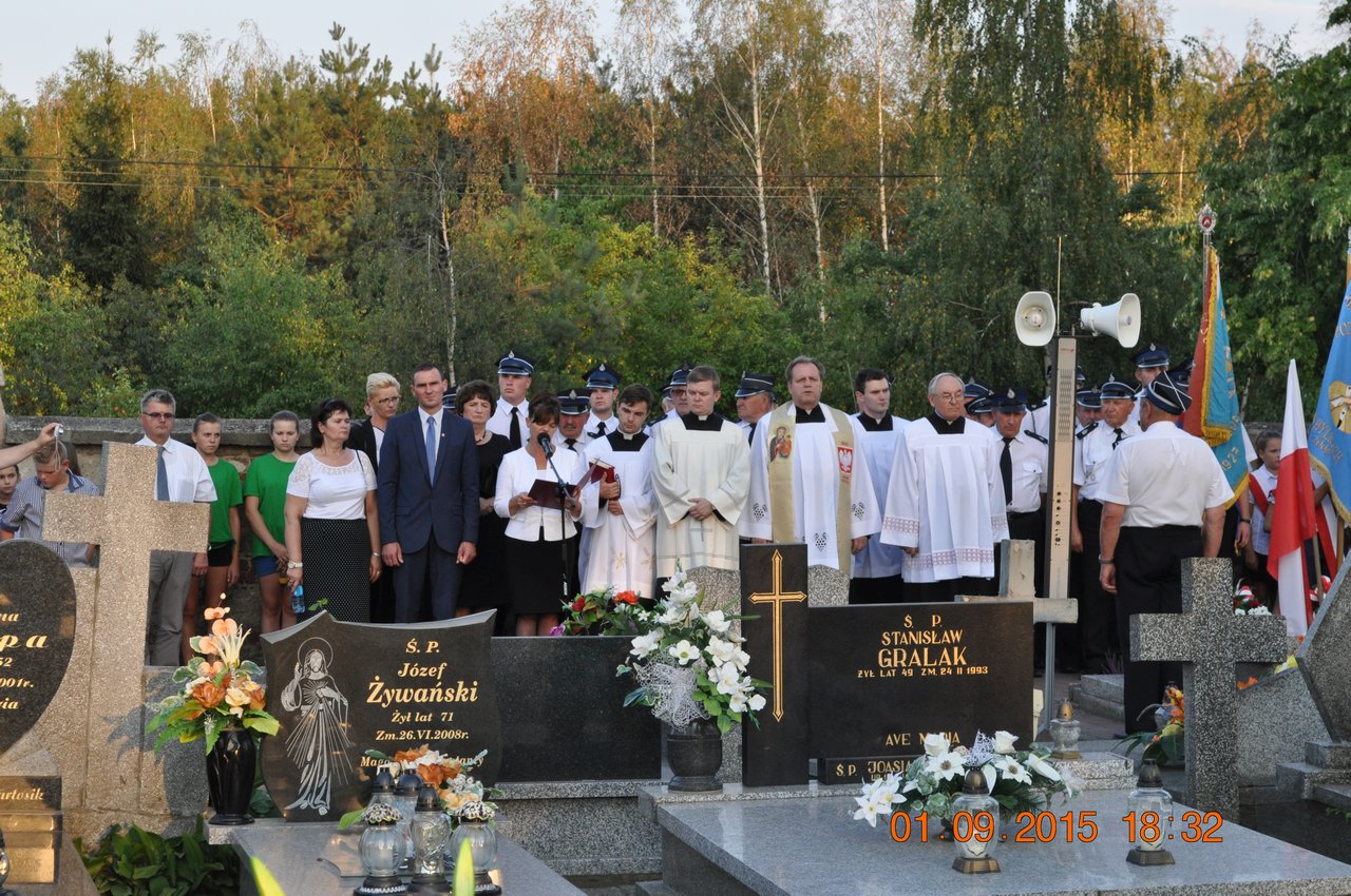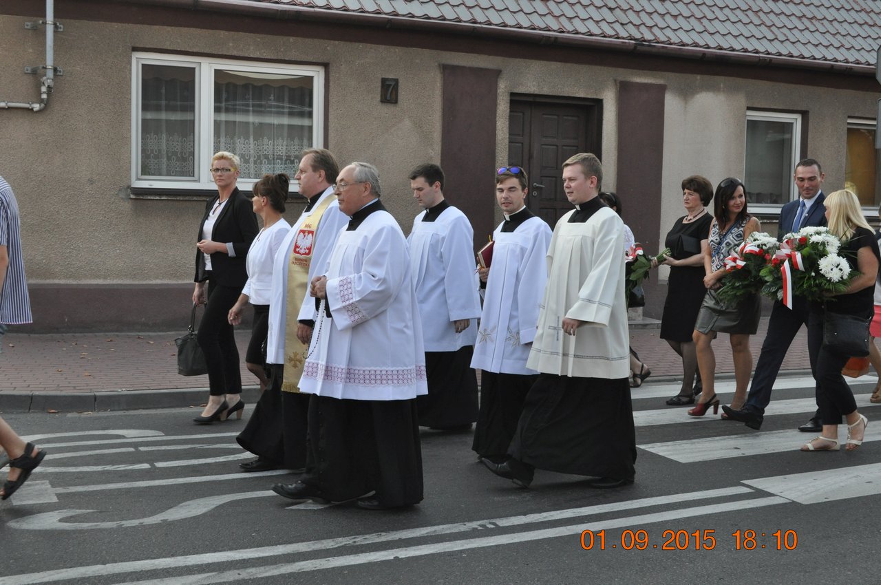 Po zbiórce przed Domem Strażaka władze gminy, poczty sztandarowe, delegacje jednostek OSP, placówek oświatowych i mieszkańcy gminy na czele z orkiestrą dętą udali się do kościoła parafialnego. Mszę św. w intencji poległych w obronie naszej ojczyzny odprawili kapłani Krzysztof Pietryga, Michał Pietrzak i Maciej Adamski. W liturgii uczestniczyli również diakon Sebastian oraz klerycy Sylwester i Bartłomiej. - 76 lat temu ludzie przeżywali tragedię, brali na siebie cios zadany w polskie serce. Nawet najmłodsze dziecko tutaj obecne wie jaką rocznicę obchodzimy. Dziś z wielką miłością pochylamy się nad grobami tych, którzy wyszli w 1939 r. bronić polskich miast i wsi. Dziękujemy, że możemy się modlić nad ich grobami o pokój na świecie, bo czegóż więcej nam trzeba. Tego pokoju i współpracy między narodami potrzeba dzisiaj światu - powiedział w kazaniu ks. proboszcz Krzysztof Pietryga.