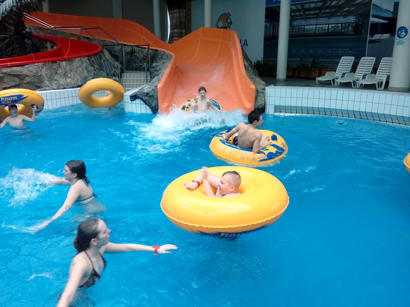 Po udanej zabawie na lodowisku, głodni wrażeń pojechaliśmy do Aquaparku ,, Fala”. Zjeżdżalnie, pontony, jacuzzi, baseny i basen z falą to atrakcje, z których korzystali uczestnicy wycieczki. Czas spędzony w wodzie przysporzył wszystkim uczestnikom wyjazdu wiele radości i przyjemnych wrażeń. Z Aquaparku ,, Fala” udaliśmy się do Restauracji MacDonald, gdzie dzieci otrzymały zestaw Happy Meal.
