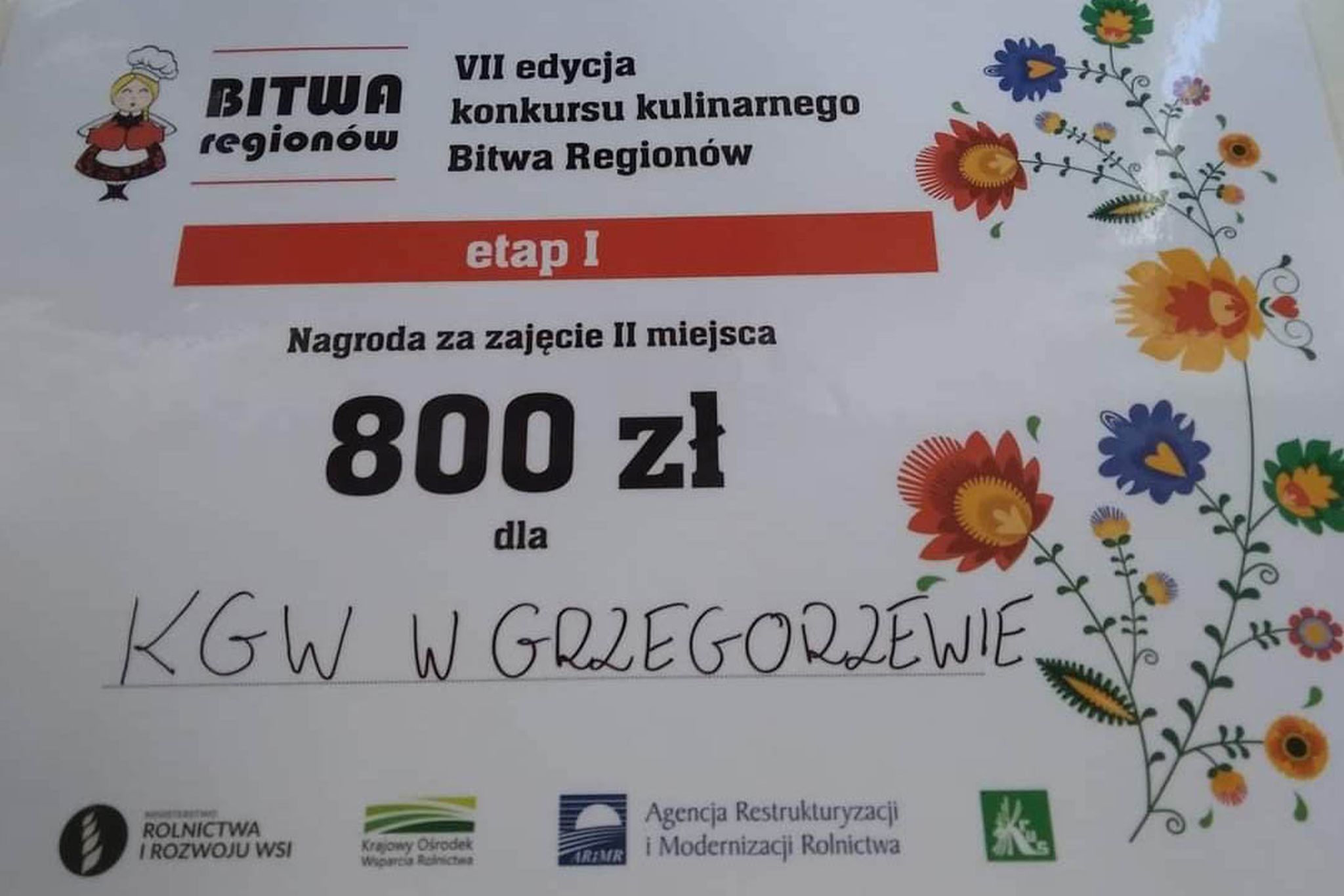 Na zaproszenie organizatorów w konkursie wzięły udziaÅ‚ dwa KoÅ‚a GospodyÅ„ Wiejskich z Naszej Gminy – KGW KieÅ‚czewek i KGW Grzegorzew. Ich udziaÅ‚ zakoÅ„czyÅ‚ siÄ™ wielkim sukcesem. KGW Grzegorzew zajęło II miejsce w konkursie dziÄ™ki przygotowaniu wegaÅ„skiej zupy dyniowej z kluseczkami przecieranymi i posypkÄ… z pÅ‚atków migdaÅ‚owych. DziÄ™ki temu otrzymaÅ‚y nagrodÄ™ w kwocie 800 zÅ‚ ufundowanÄ… przez organizatorów. Natomiast KGW KieÅ‚czewek otrzymaÅ‚o wyróżnienie za potrawÄ™ - Pasztet z zajÄ…ca, oraz nagrody – przenoÅ›nÄ… kuchenkÄ™ wraz z gadżetami.