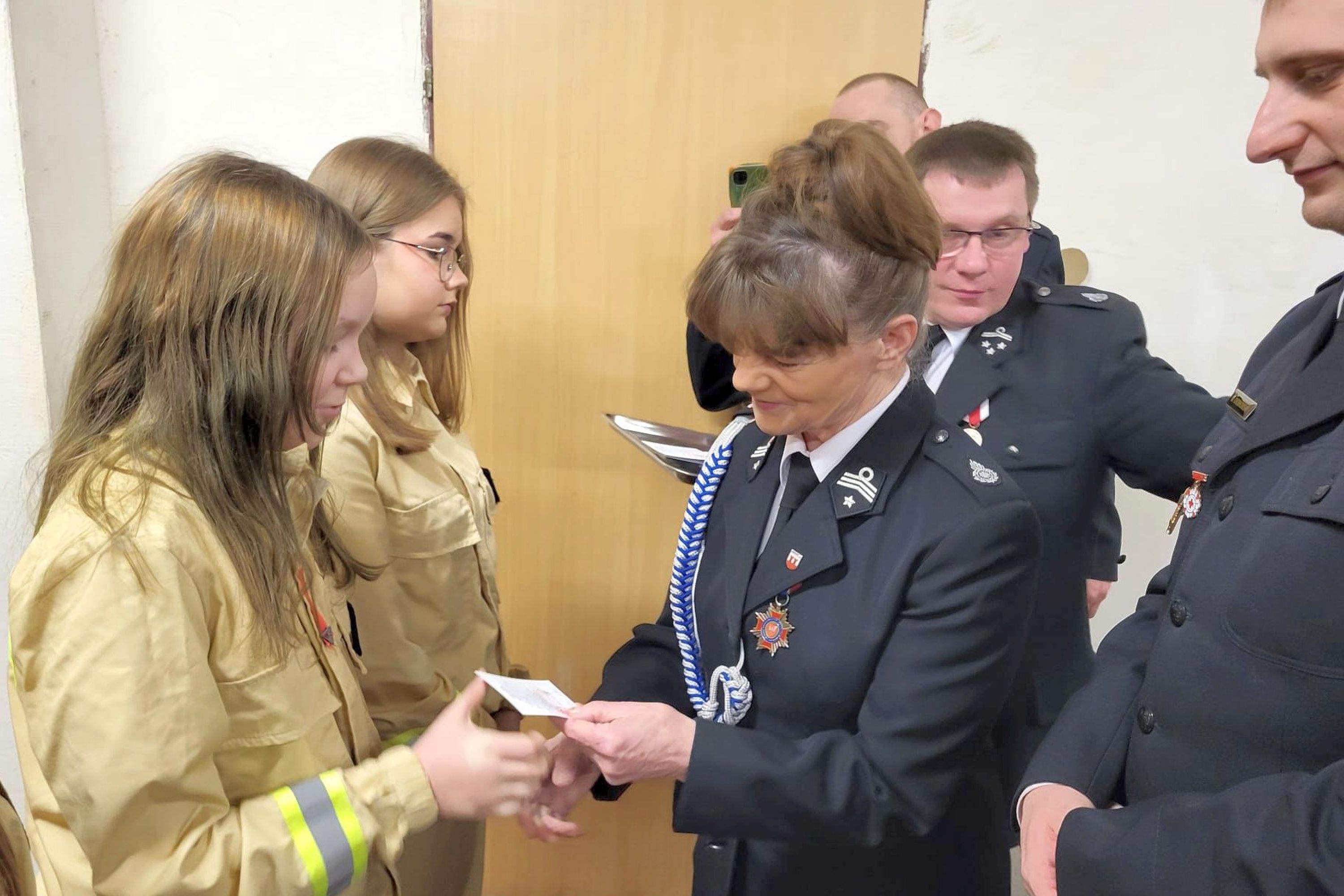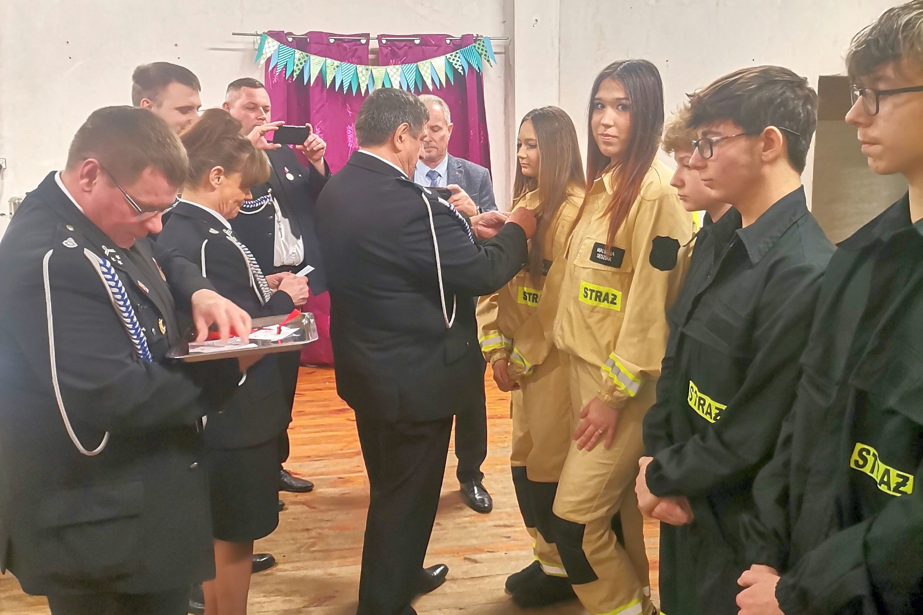 W trakcie zebrania wręczono srebrne i brązowe odznaczenia dla członków Młodzieżowych Drużyn Pożarniczych za zaangażowanie i służbę.