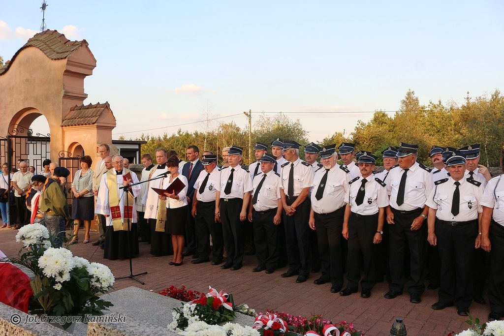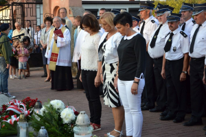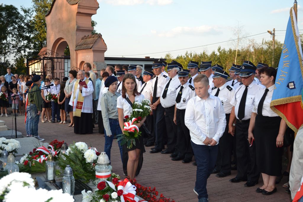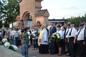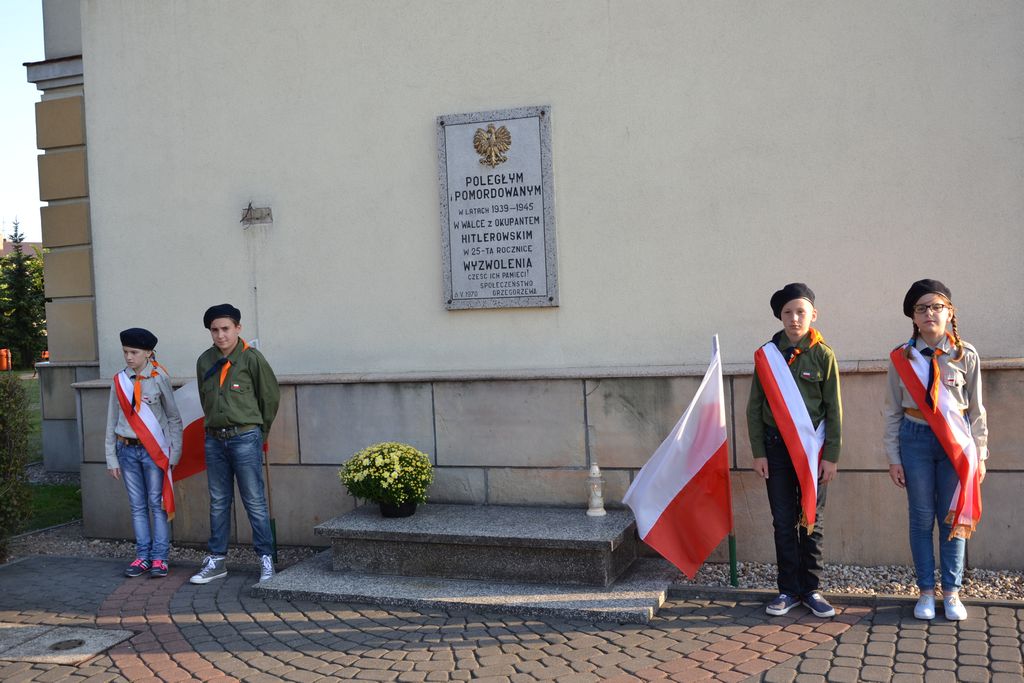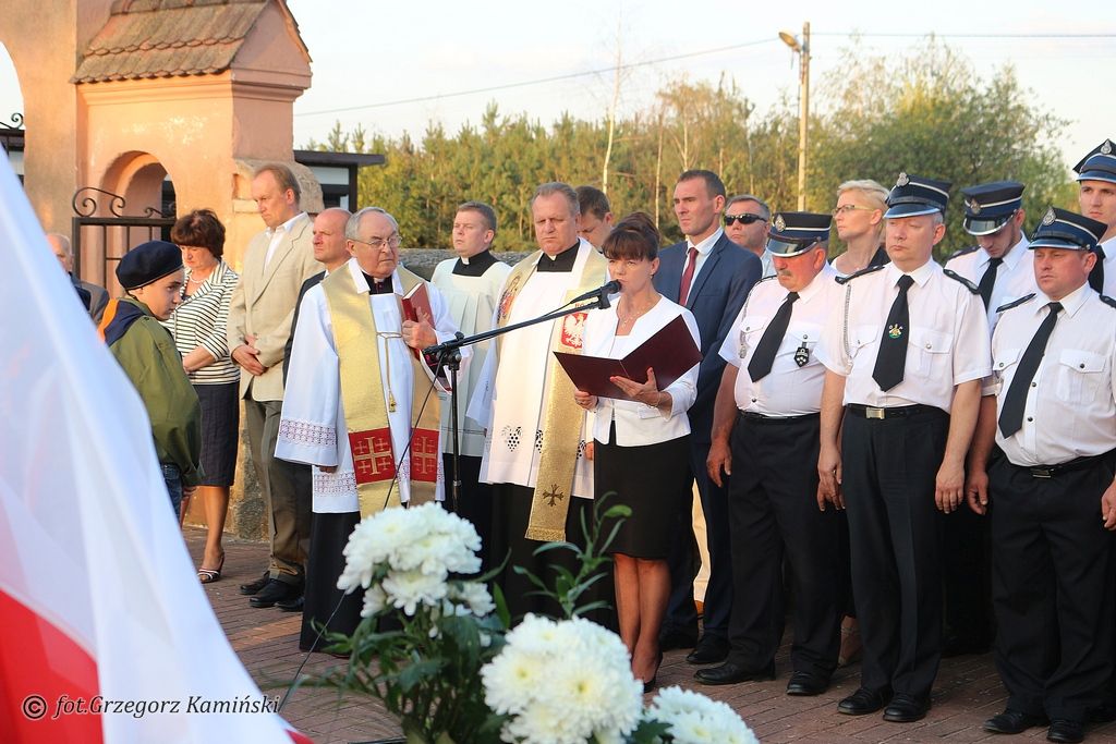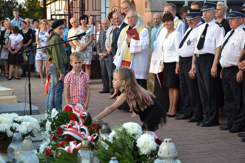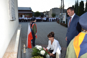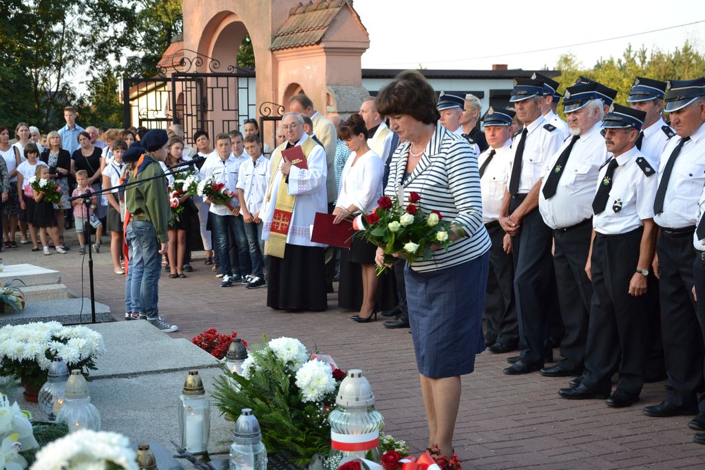 Po nabożeństwie wszyscy zebrani przeszli przed Urząd Gminy żeby złożyć hołd poległym w latach 1931-1945. Pani Wójt Bożena Dominiak wraz z Przewodniczącym Rady Gminy panem Waldemarem Banasiakiem złożyli kwiaty i zapalili znicze przed tablica upamiętniającą poległych.