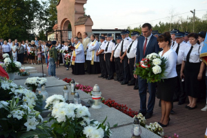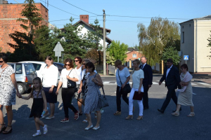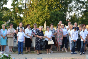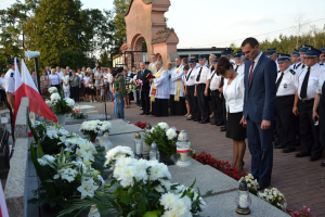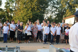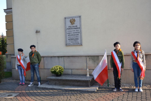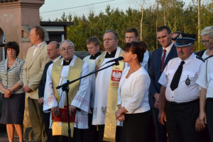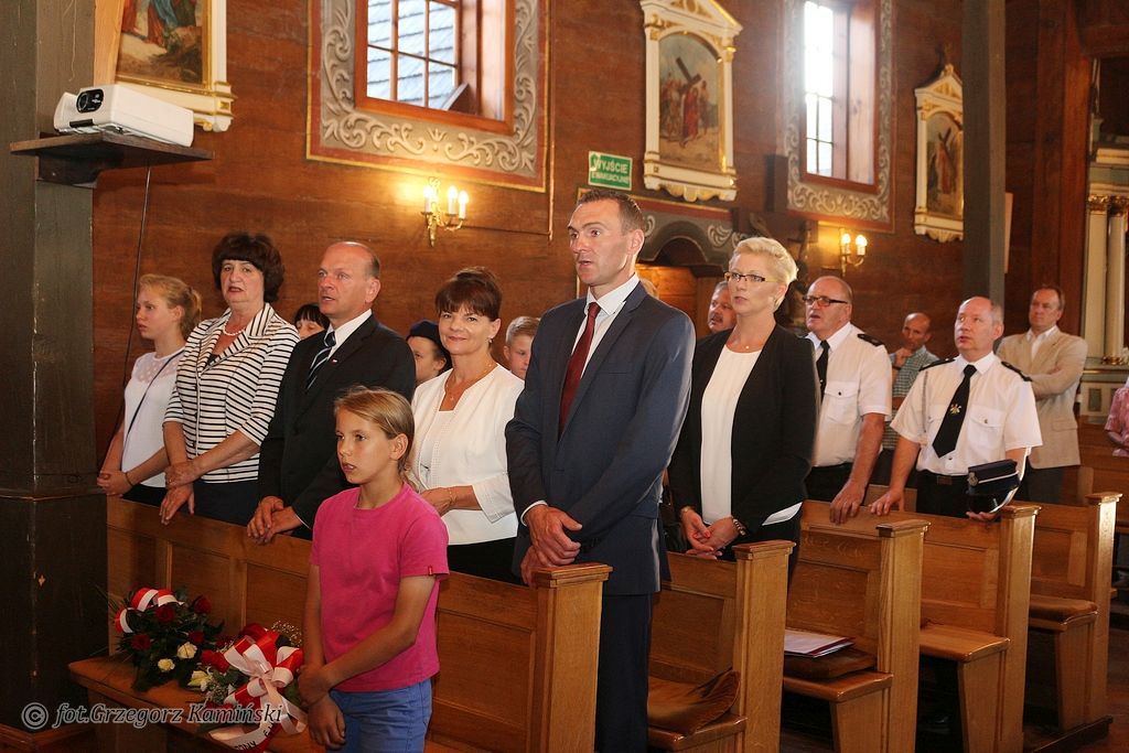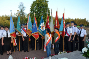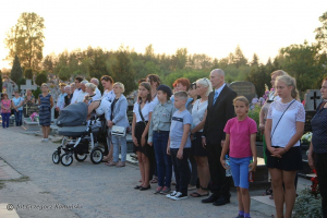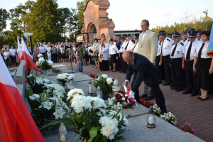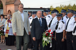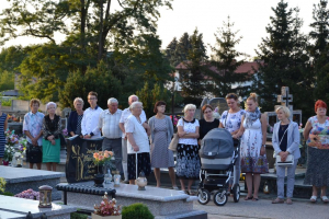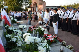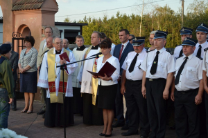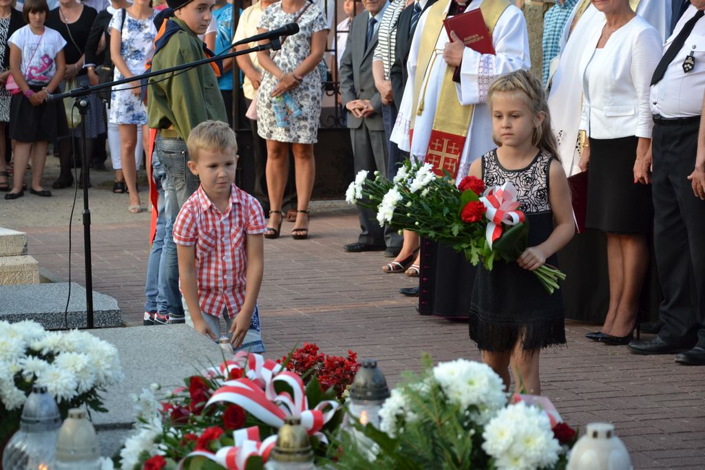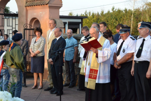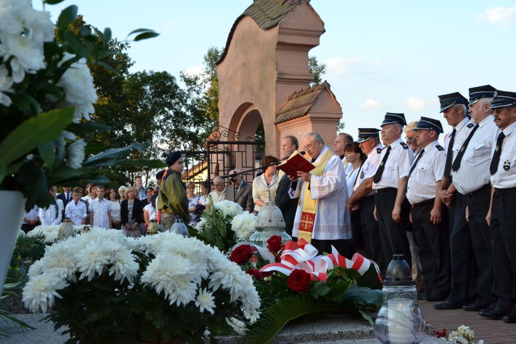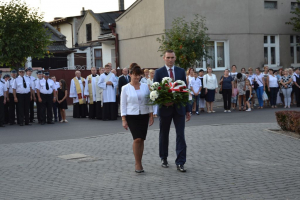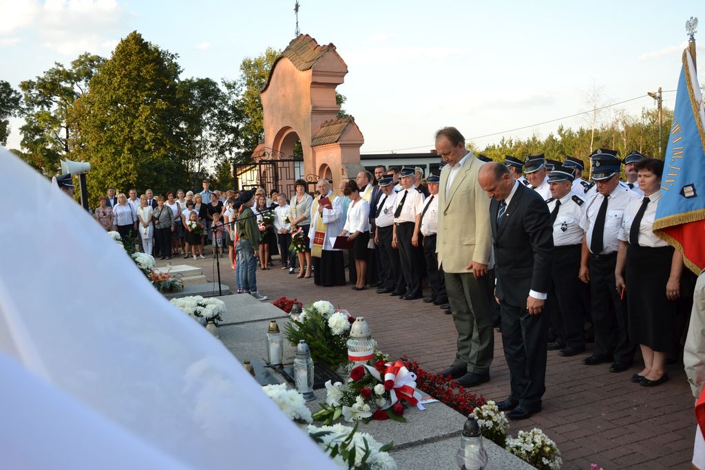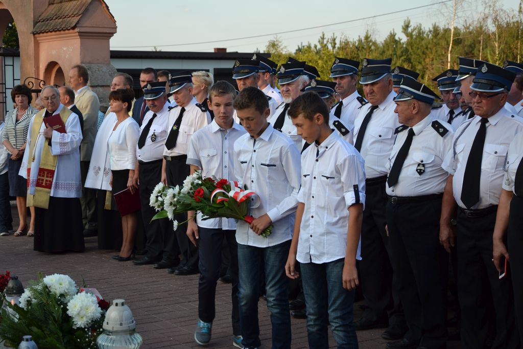 Po nabożeństwie wszyscy zebrani przeszli przed Urząd Gminy żeby złożyć hołd poległym w latach 1931-1945. Pani Wójt Bożena Dominiak wraz z Przewodniczącym Rady Gminy panem Waldemarem Banasiakiem złożyli kwiaty i zapalili znicze przed tablica upamiętniającą poległych.
