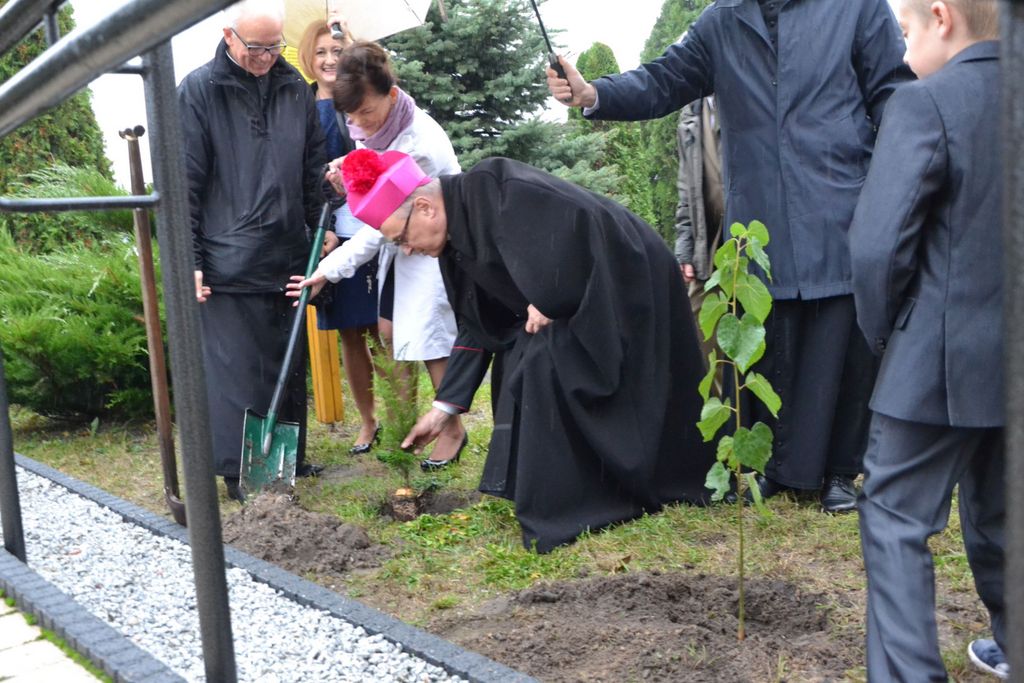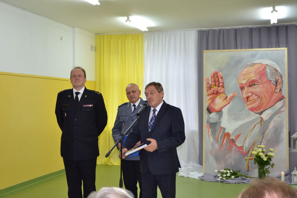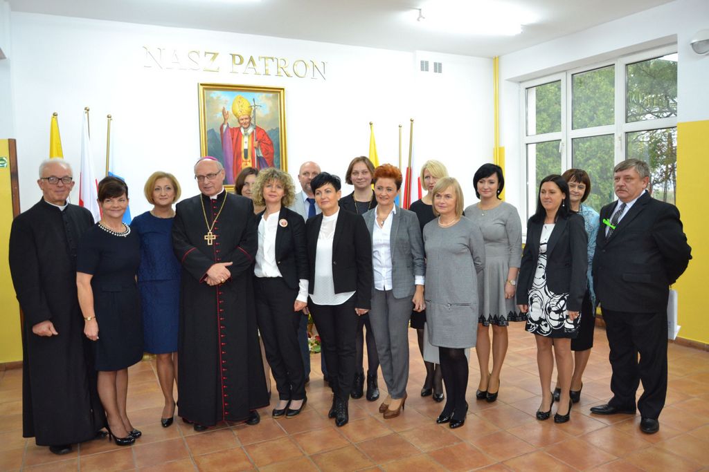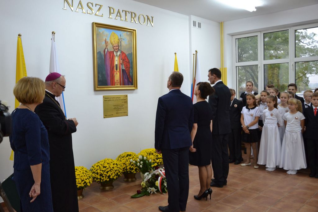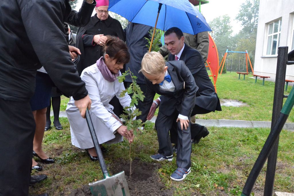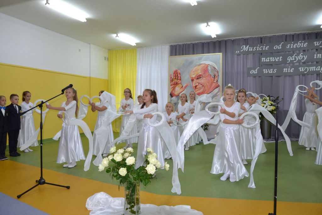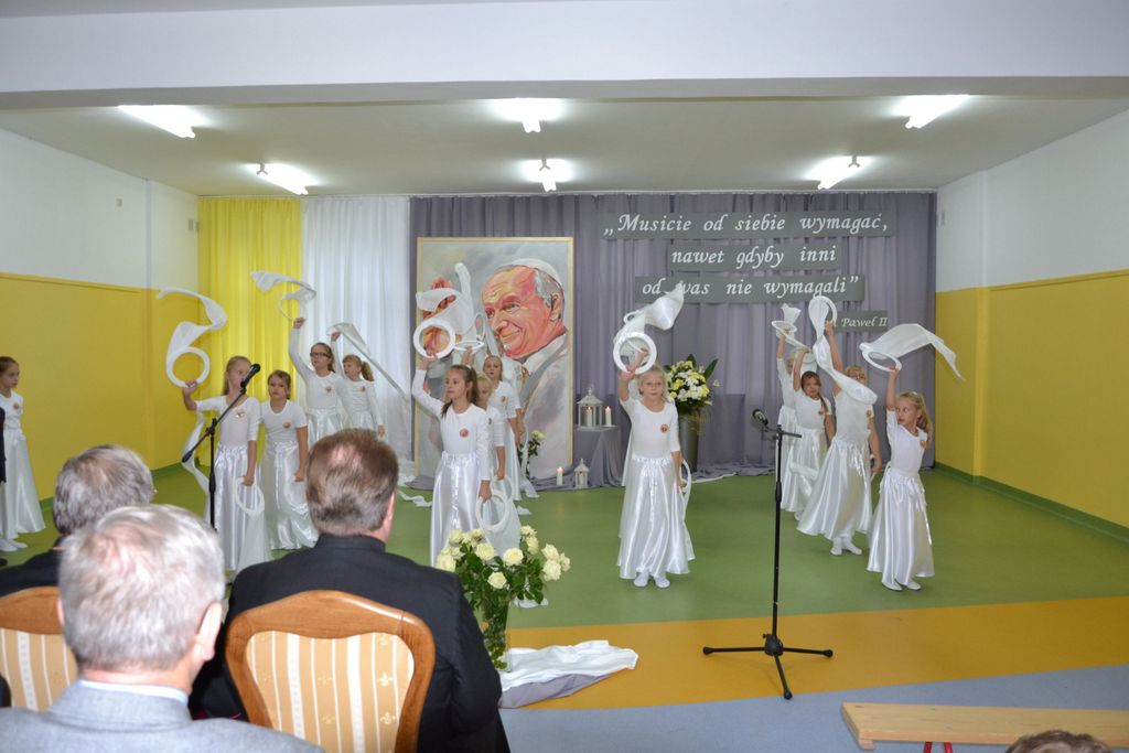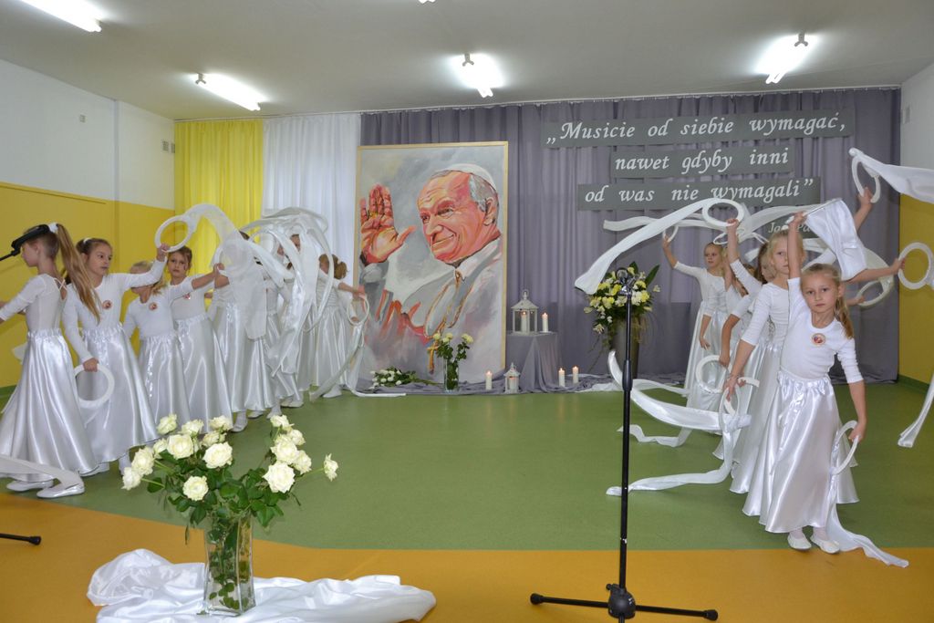 Po uroczystej Mszy ÅšwiÄ™tej wypuszczono w niebo balony, w których znajdowaÅ‚y siÄ™ przesÅ‚ania Ojca ÅšwiÄ™tego Jana PawÅ‚a II. Dalszy ciÄ…g uroczystoÅ›ci miaÅ‚ miejsce w budynku szkoÅ‚y. Na pamiÄ…tkÄ™ chrztu Polski i jubileuszu zasadzono drzewa z udziaÅ‚em KsiÄ™dza Biskupa WiesÅ‚awa Alojzego Meringa, przedstawicieli wÅ‚adz samorzÄ…dowych na czele z PaniÄ… Wójt BożenÄ… Dominiak oraz spoÅ‚ecznoÅ›ci szkolnej. Zaproszeni na uroczystość goÅ›cie mieli okazjÄ™ obejrzeć dwie wystawy. Jedna z nich byÅ‚a poÅ›wiÄ™cona naszemu Patronowi, a druga zatytuÅ‚owana „ 10 lat minęło …” upamiÄ™tniaÅ‚a najważniejsze wydarzenia z życia szkoÅ‚y w ciÄ…gu ostatniej dekady. Przygotowani pod kierunkiem nauczycieli uczniowie zaprezentowali część artystycznÄ…. MÅ‚odzi artyÅ›ci uczcili pamięć o Papieżu wierszami, piosenkami i taÅ„cem, a z gÅ‚oÅ›ników popÅ‚ynÄ…Å‚ gÅ‚os Patrona z ważnymi przesÅ‚aniami skierowanymi do mÅ‚odzieży. WystÄ™p nagrodzono gromkimi brawami, po czym zebrani goÅ›cie przekazali na rÄ™ce dyrekcji szkoÅ‚y Pani Iwony ZiÄ™tek gratulacje i serdeczne życzenia.