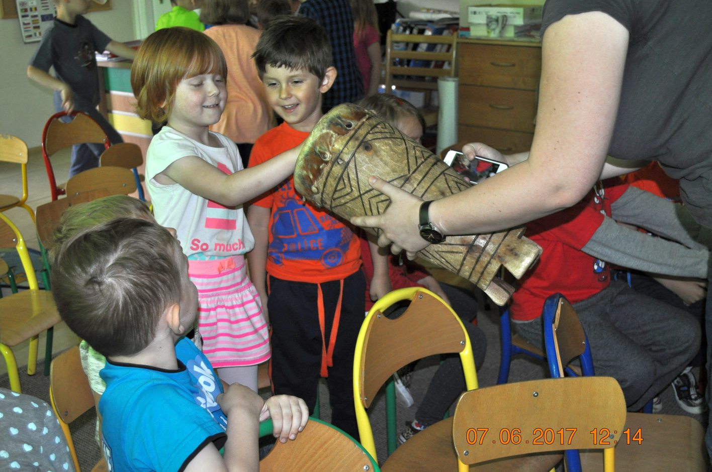 Autor przedstawił prezentacje multimedialną, dzięki której dzieci mogły zobaczyć i usłyszeć dźwięki jakie wydają i jak się zachowują afrykańskie zwierzęta. Następnie autor opowiadał dzieciom jakie spotkały go niebezpieczne przygody, spotkania z egzotyczną przyrodą i mieszkańcami. Każdy uczestnik spotkania miał okazję przymierzyć afrykański turban, zagrać na prawdziwym afrykańskim bębnie oraz położyć się na poduszce zrobionej z drewna.
