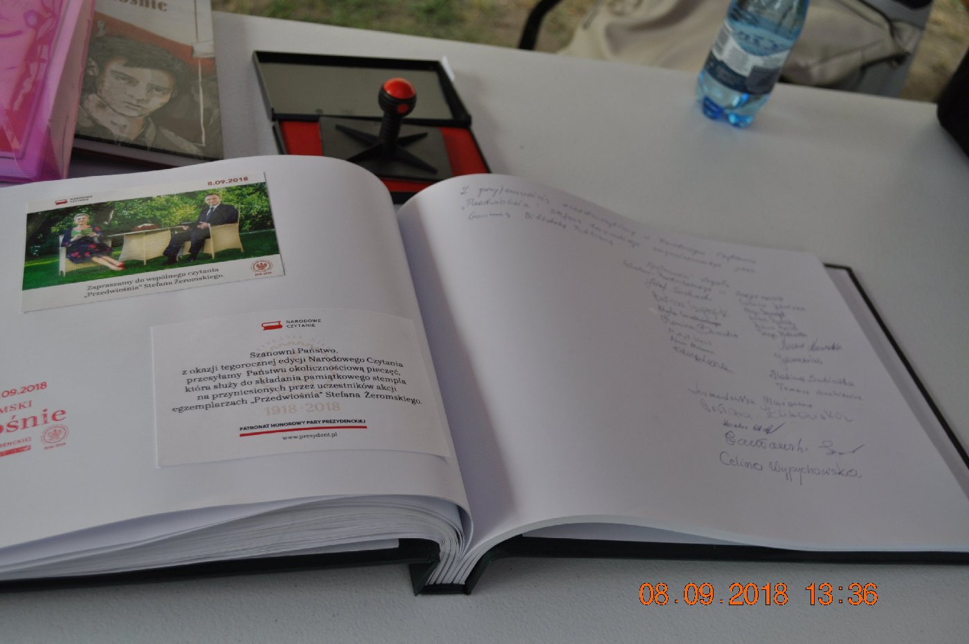 W parku przygotowane zostało miejsce, z którego lektorzy odczytywali kolejne fragmenty powieści. Każdy uczestnik akcji otrzymywał z rąk pani Wójt Bożeny Dominiak podziękowanie oraz książkę Stefana Żeromskiego w której odciśnięta była pieczęć przesłana przez Kancelarię Prezydenta.