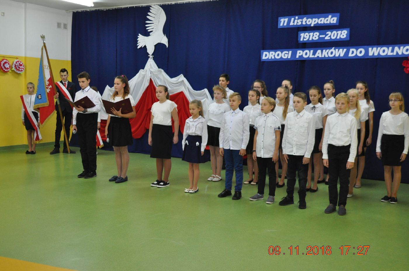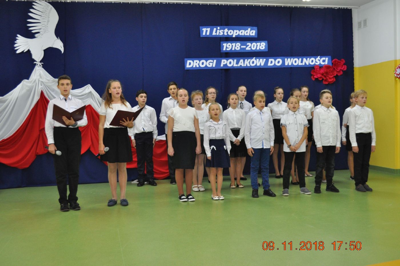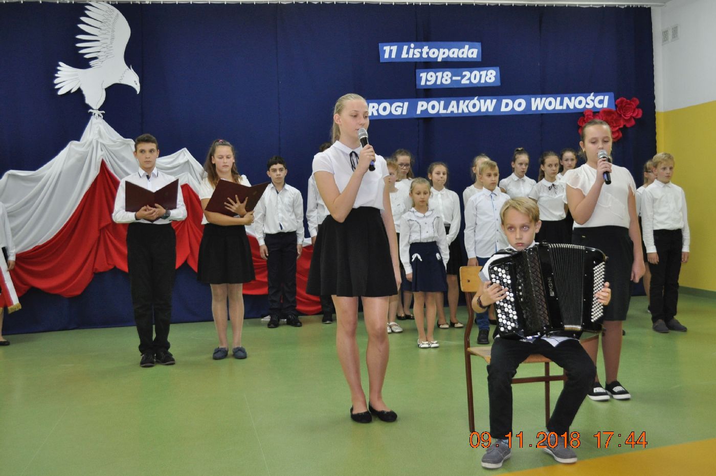 Z okazji wielkiego jubileuszu uczniowie wszystkich Szkół Podstawowych z naszej gminy przygotowali wzruszające montaże słowno-muzyczne aby uroczyście przeżyć nasze wielkie święto wolności.