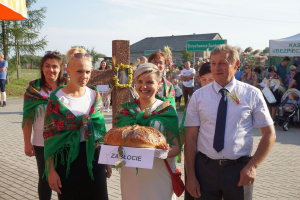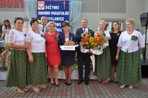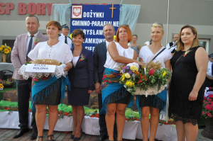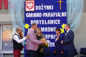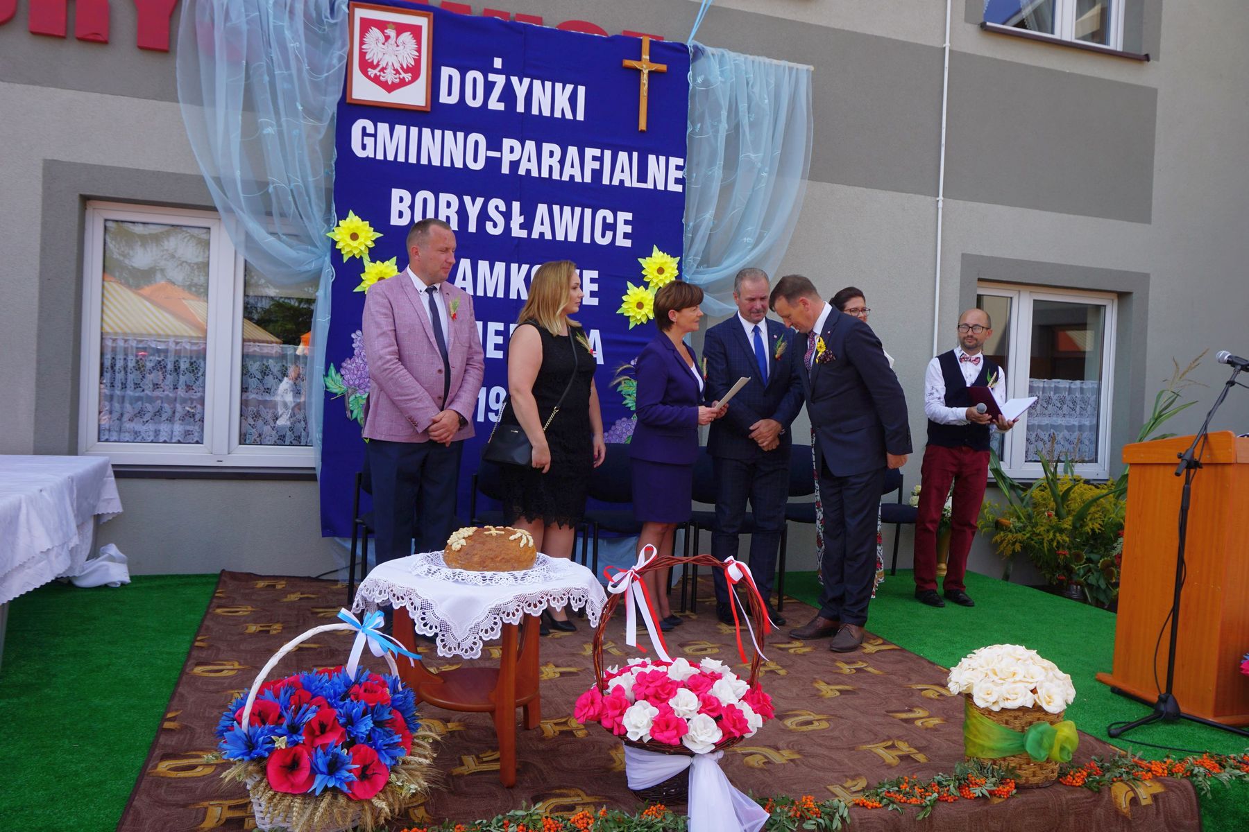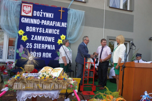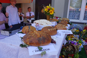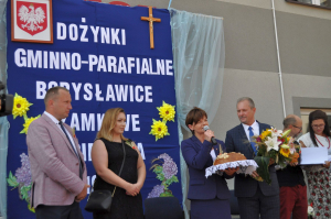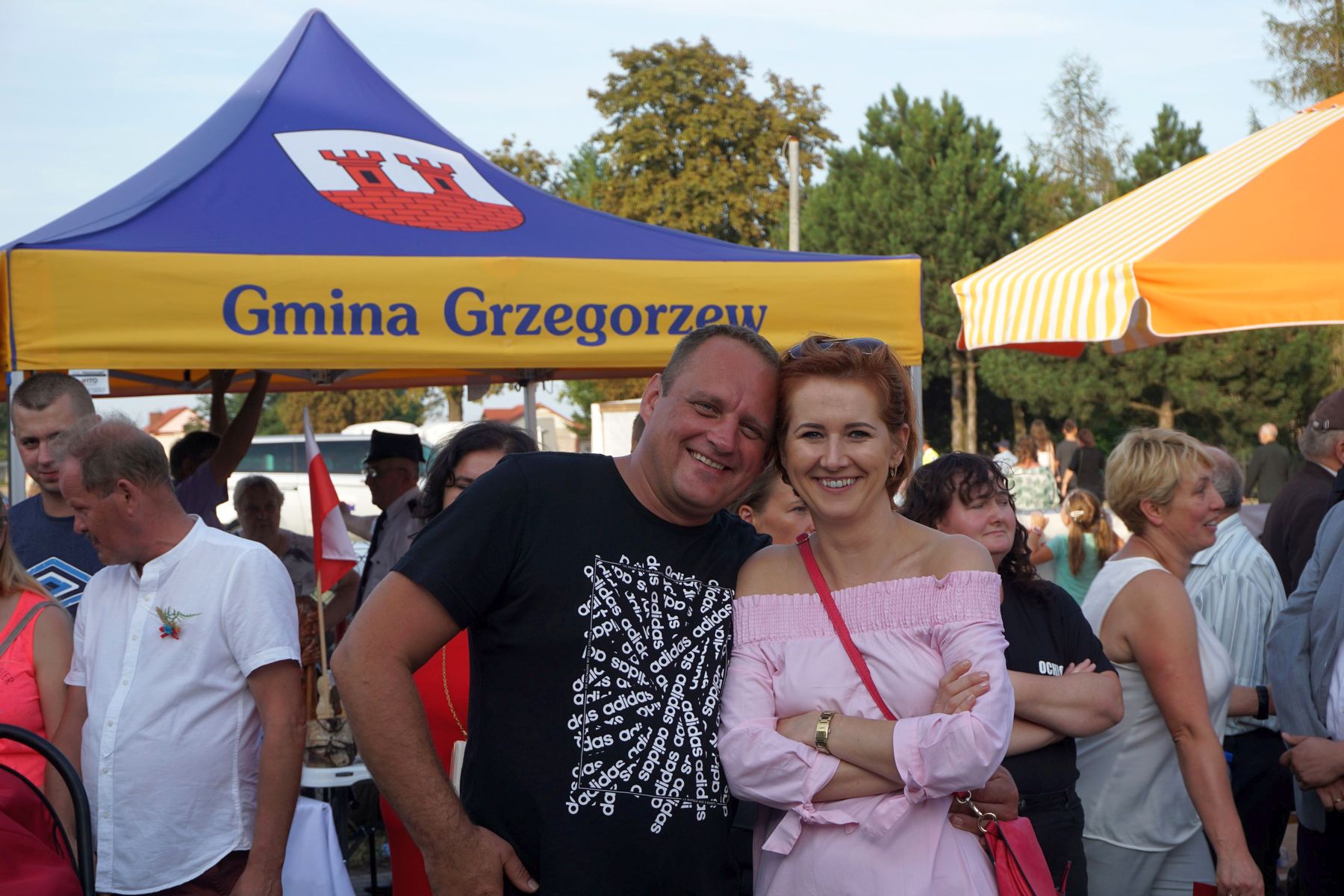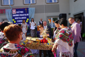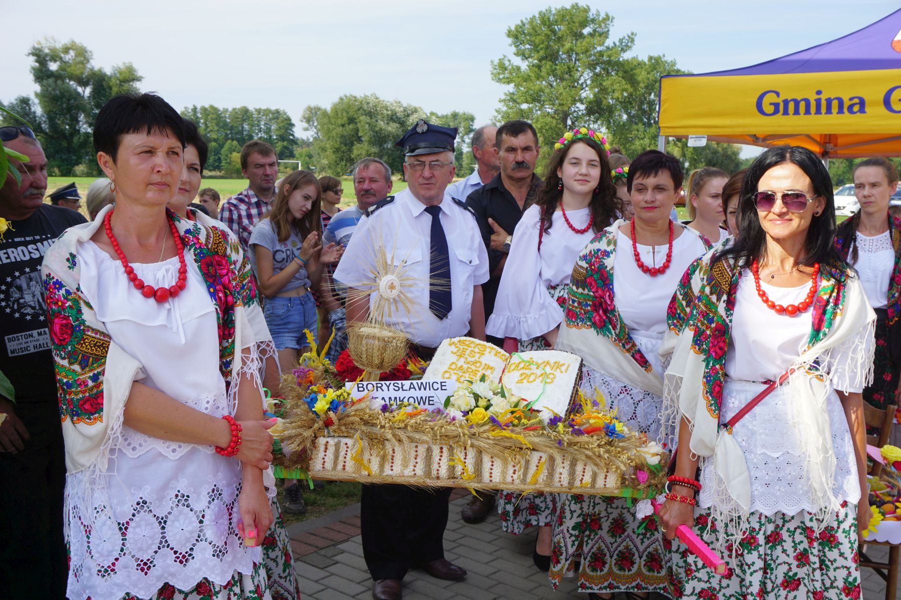 Uroczystości dożynkowe rozpoczęła Msza Święta dziękczynna w intencji rolników, którą sprawowali Proboszcz Parafii pw. Wniebowzięcia NMP w Borysławicach Kościelnych Ks. Andrzej Piesik i Ks. Andrzej Działdowski Proboszcz Parafii Św. Rocha w Barłogach. Kapłani przyjęli z rąk Starostów Dożynek Anny Miszczak i Sebastiana Durkiewicza, delegacji sołectw Gminy Grzegorzew oraz miejscowości Krzykosy, Dąbrówka i Złota z Parafii Borysławice, bochny chleba i owoce ziemi symbolizujące trud pracy rolnika. Po Mszy Św. w kolorowym korowodzie, w asyście Pocztów Sztandarowych oraz Gminnej Orkiestry Dętej, przemaszerowaliśmy na plac przy remizie Ochotniczej Straży Pożarnej, gdzie odbył się ceremoniał dożynkowy – przekazanie chlebów i wspólne nimi się dzielenie. Uroczystość prowadzili Monika Szymczak i Andrzej Sikorski. Dary dożynkowe – chleb, wieńce, owoce, miód, wino, kwiaty złożyły delegacje ze wszystkich 13 sołectw gminy. Żyjemy w gminie rolniczej i dzisiaj nasz wzrok, naszą uwagę kierujemy w stronę pracujących na roli dziękując za ich trud i ciężką pracę – powiedziała Wójt Bożena Dominiak odbierając wspólnie z Przewodniczącym Rady Gminy Tadeuszem Sosnowskim dary z tegorocznych zbiorów.