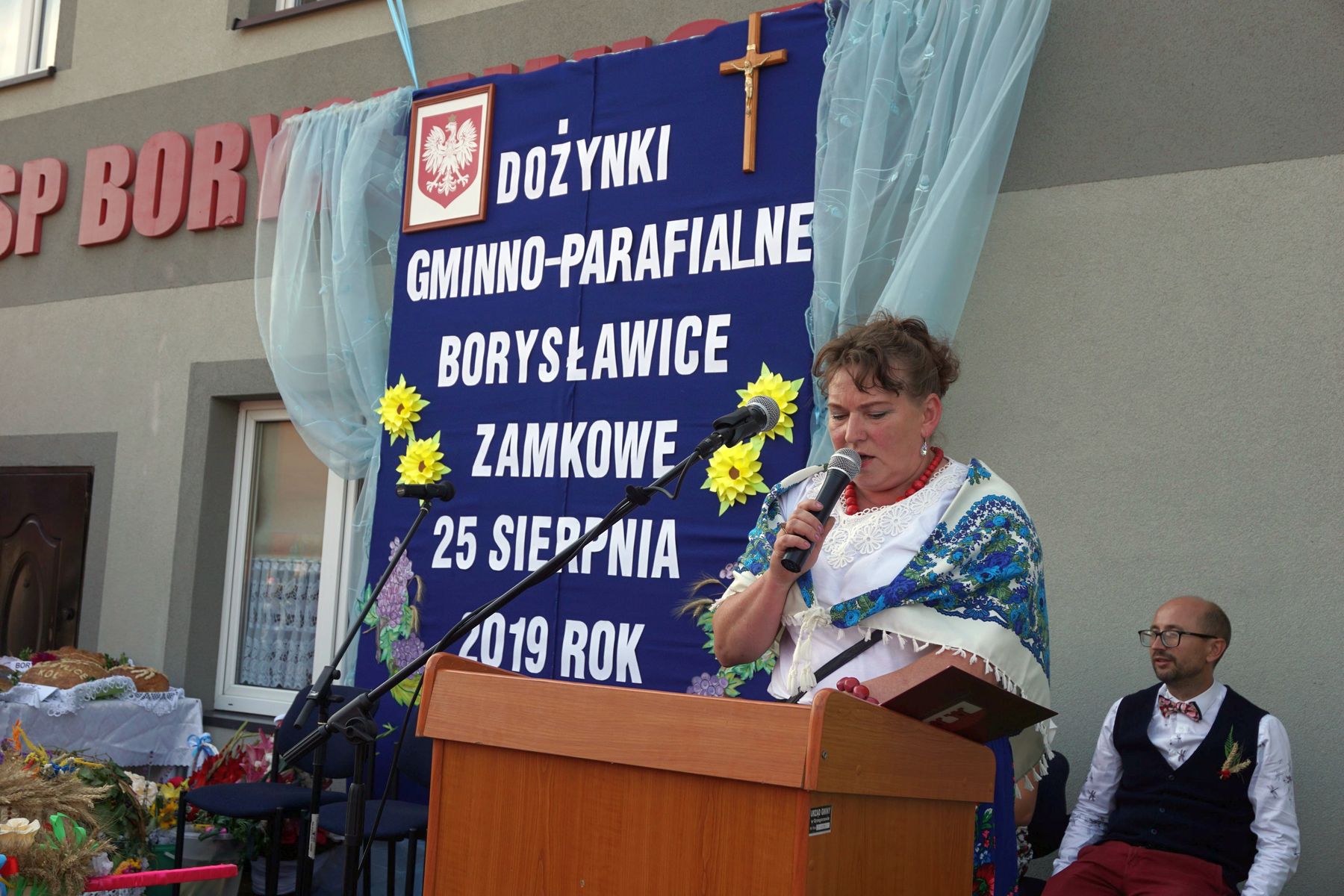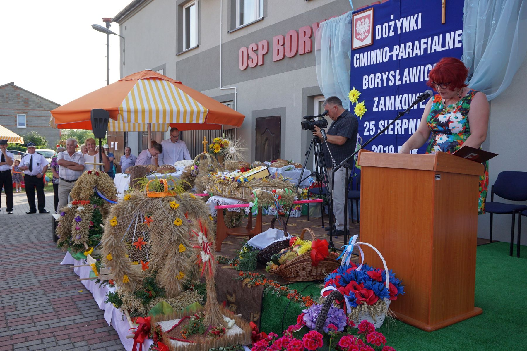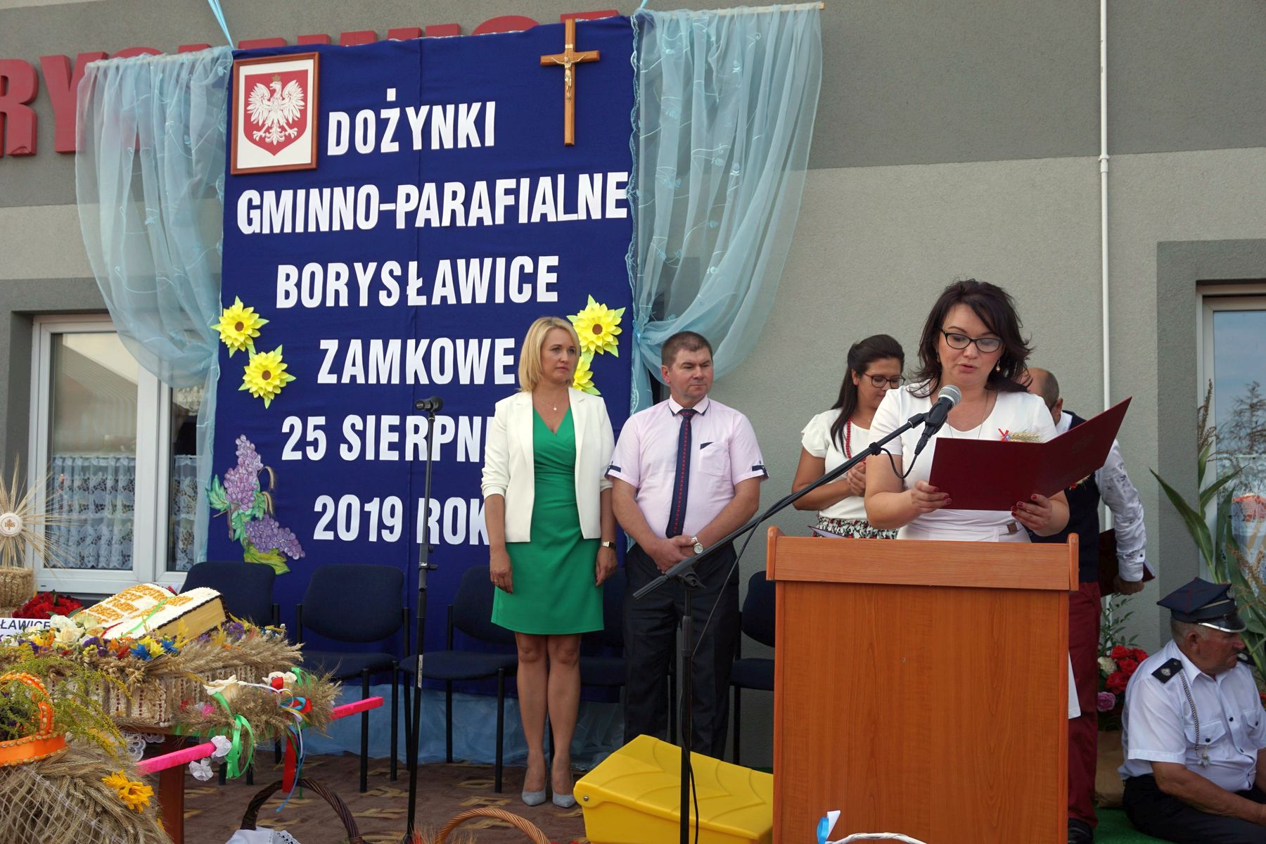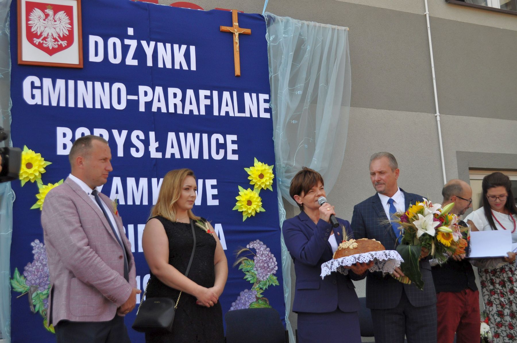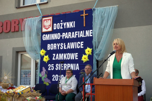 Wójt Gminy podkreśliła, że sytuacja polskiego rolnika w jednym z najbardziej rolniczych krajów Unii Europejskiej, opłacalność produkcji, gwarancja zbycia po dobrej cenie – muszą być dostrzeżone i rozwiązane. „ Niech ten chleb łączy nas ! Nie dzieli…, – powiedziała Wójt Bożena Dominiak. Obiecała dzielić bochen samorządowego chleba mądrze i sprawiedliwie. Zwieńczeniem uroczystości było ośpiewanie wieńców, tradycyjne dożynkowe przyśpiewki. W trakcie dożynek mogliśmy degustować pyszne ciasta i potrawy przygotowane przez gospodarzy – mieszkańców Borysławic Zamkowych. Dziękujemy Pani Monice Banasiak – Kierownikowi KRUS w Kole za zorganizowanie dla naszych rolników Konkursu Wiedzy o BHP w Rolnictwie. Wieczór zakończyliśmy zabawą taneczną.
