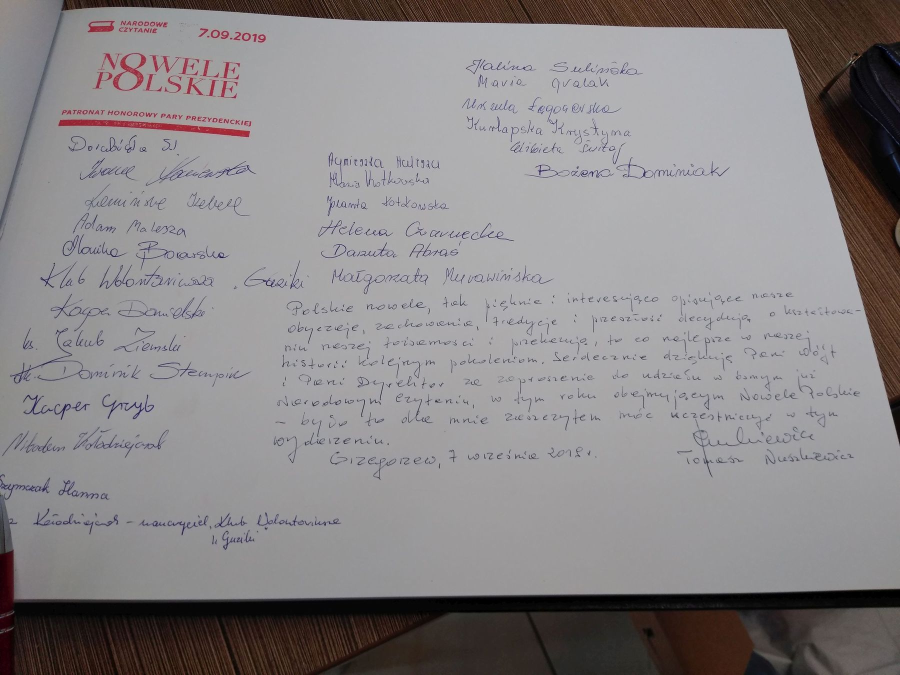 Wyboru fragmentów dzieł dokonała Pani Iwona Gajda. Natomiast w klimat czytanych opowiadań wprowadziła Pani Iwona Kaniewska. Spotkanie rozpoczęło się od przekazania przez Lenę Kolasę treści listu prezydenta Andrzeja Dudy skierowanego do jego uczestników. W czytaniu wzięło udział wielu mieszkańców gminy. Dużo osób przyszło też posłuchać prezentowanych nowel.