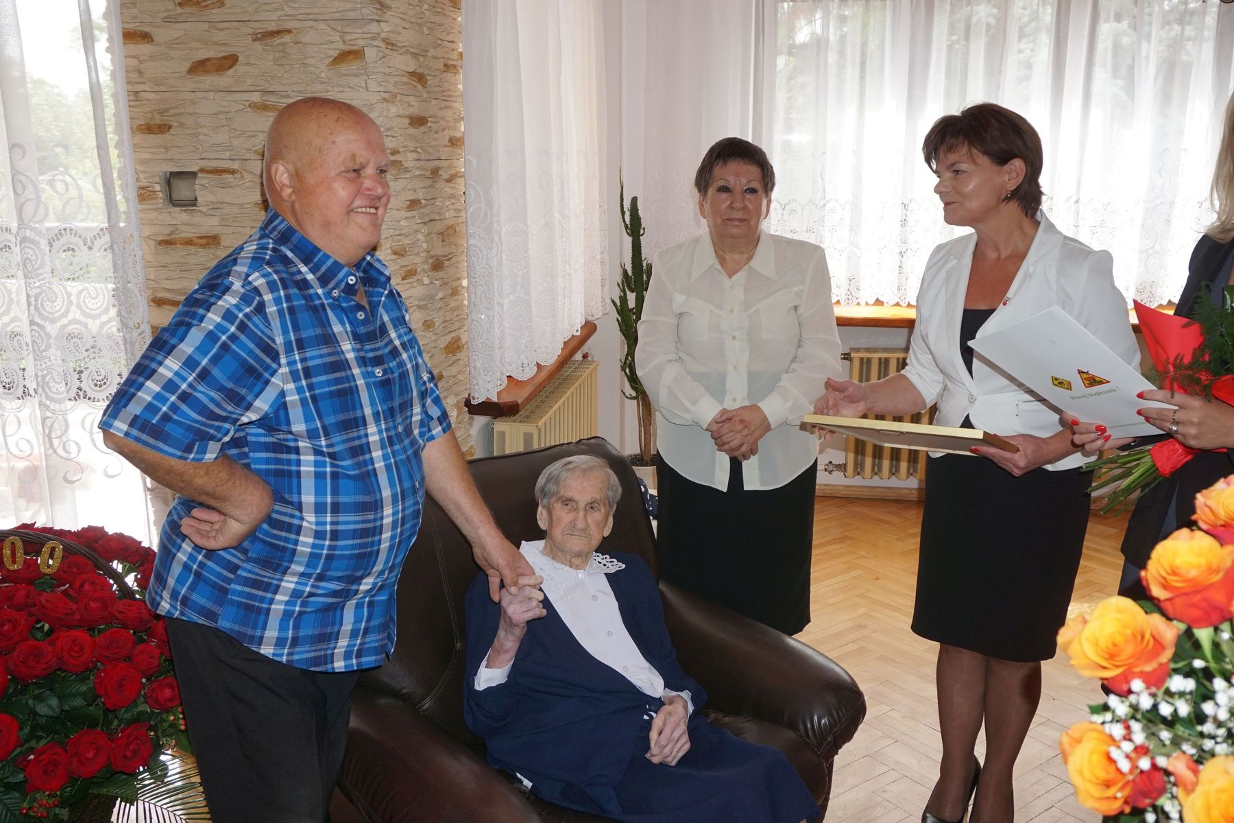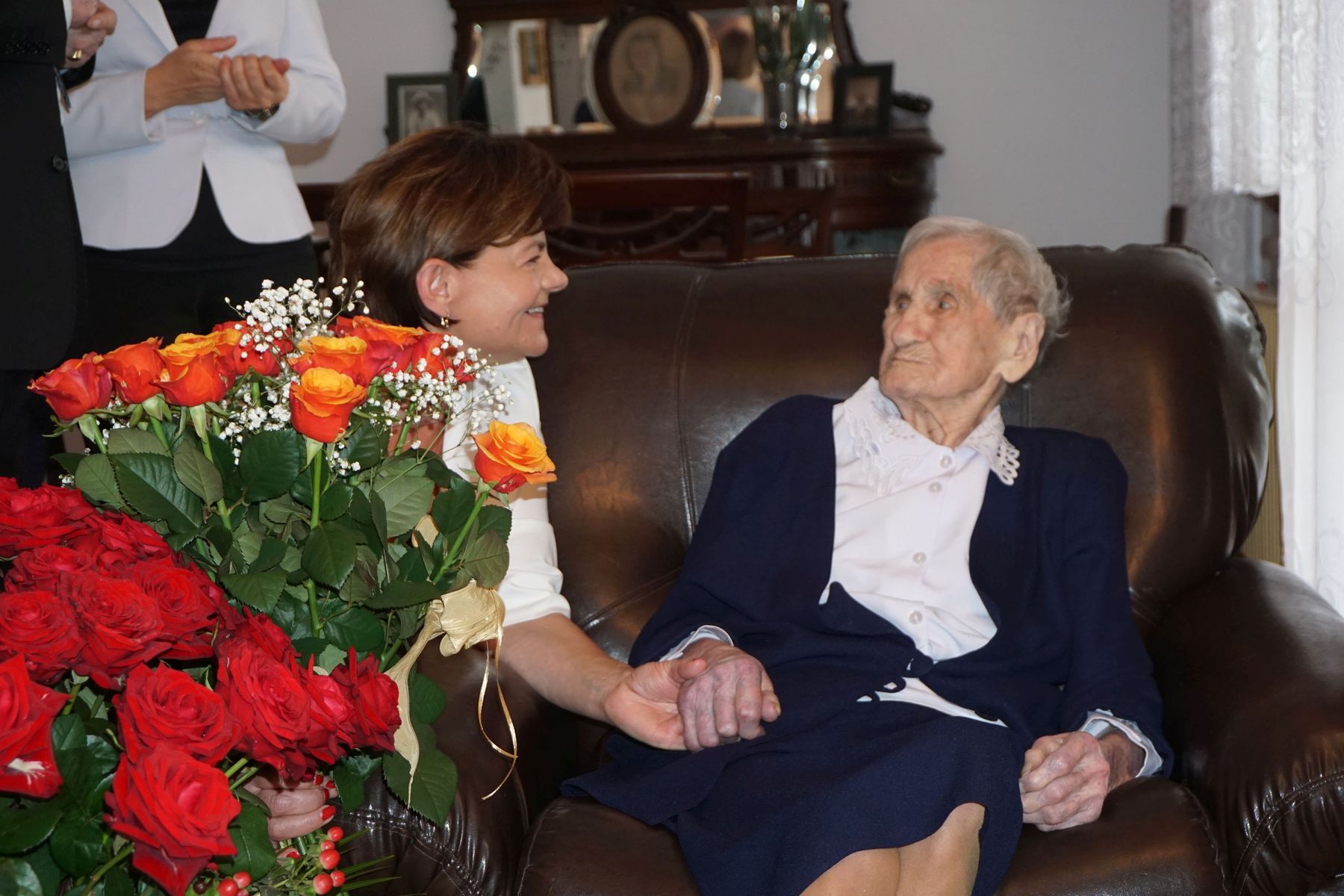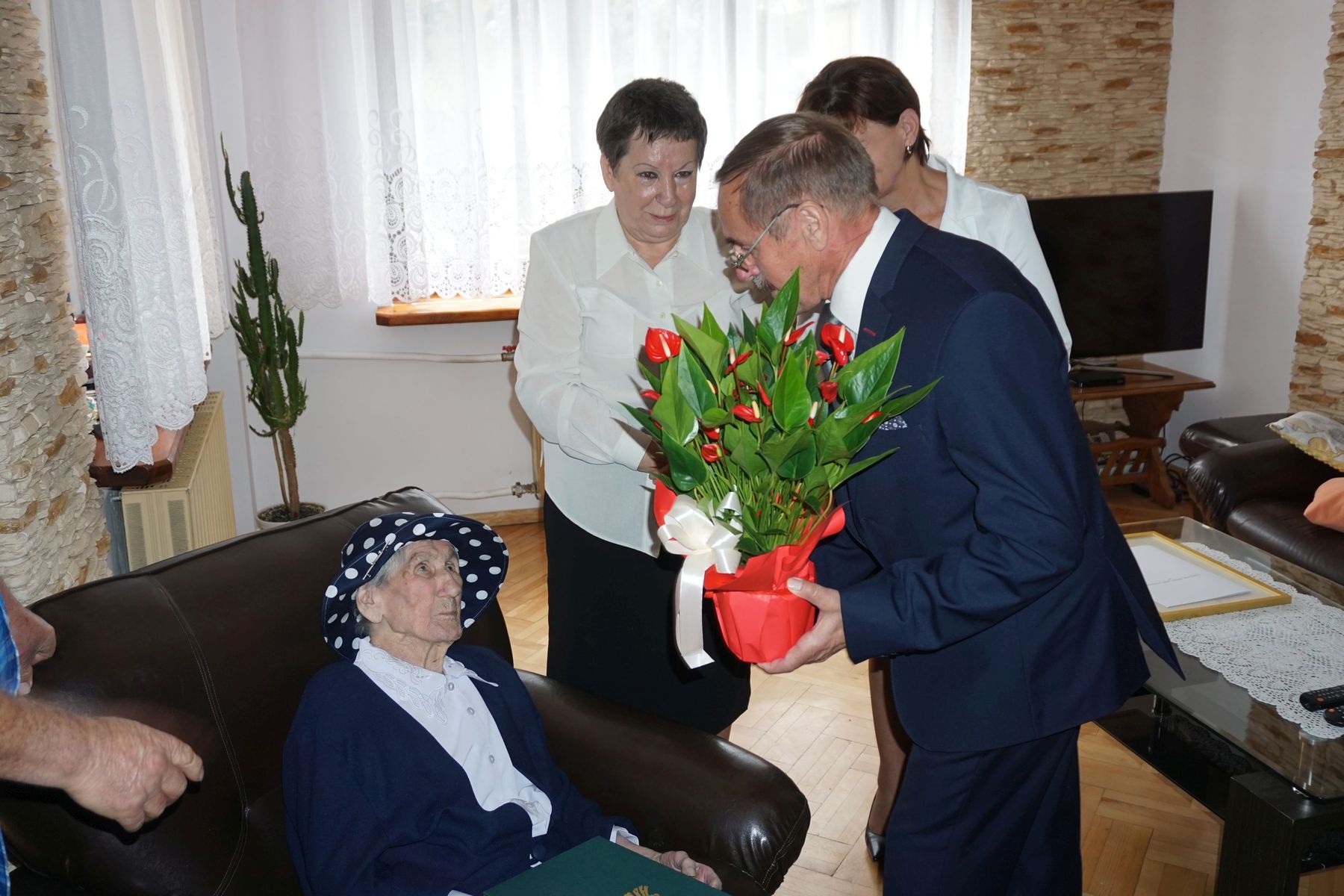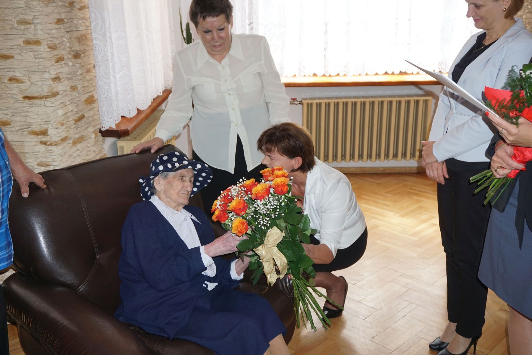 Na ręce Jubilatki Pani Wójt przekazała życzenia, upominek, bukiet róż oraz list gratulacyjny od Prezesa Rady Ministrów Pana Mateusza Morawieckiego. Uśmiechnięta Jubilatka cierpliwie przyjmowała życzenia, serdeczności i naręcza kwiatów. Nie zabrakło też toastu i lampki szampana.