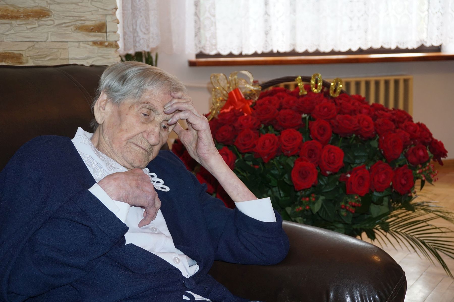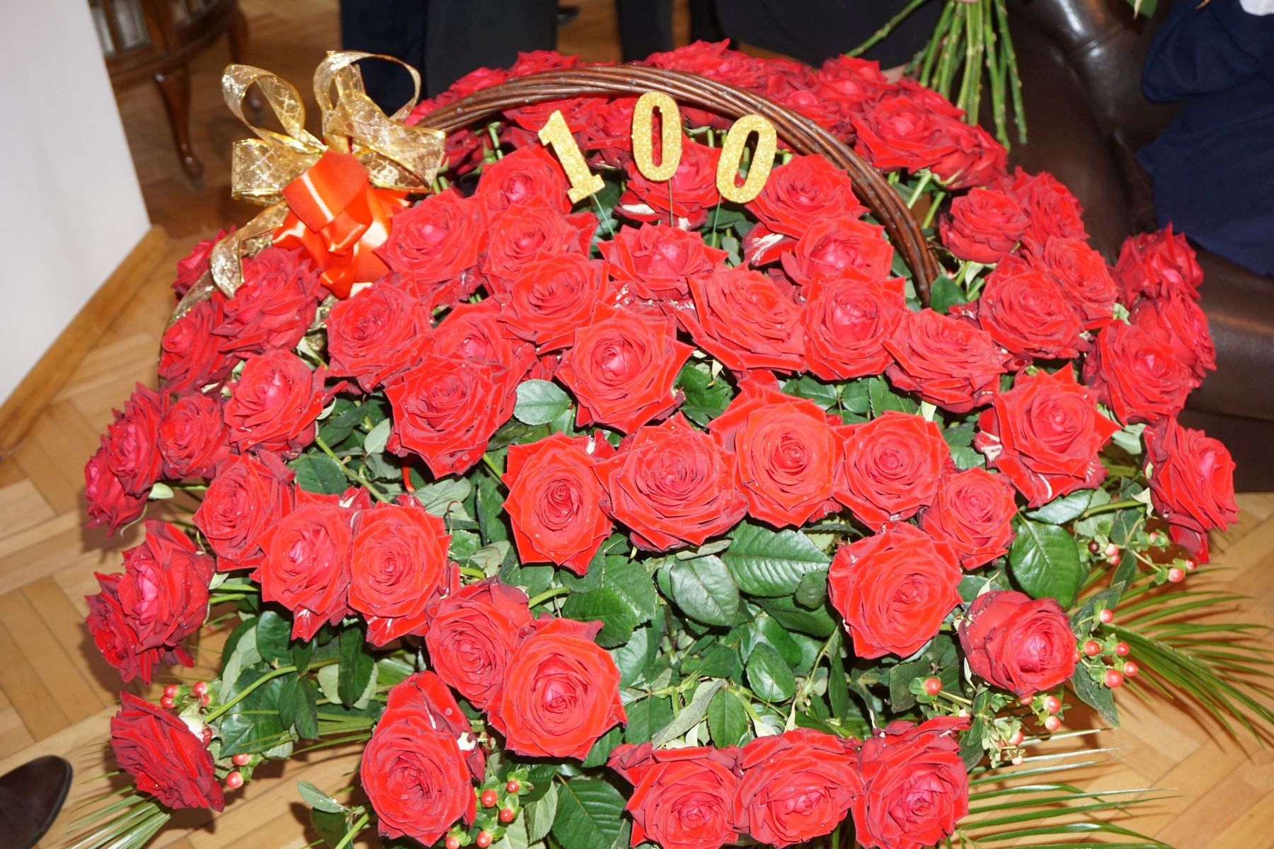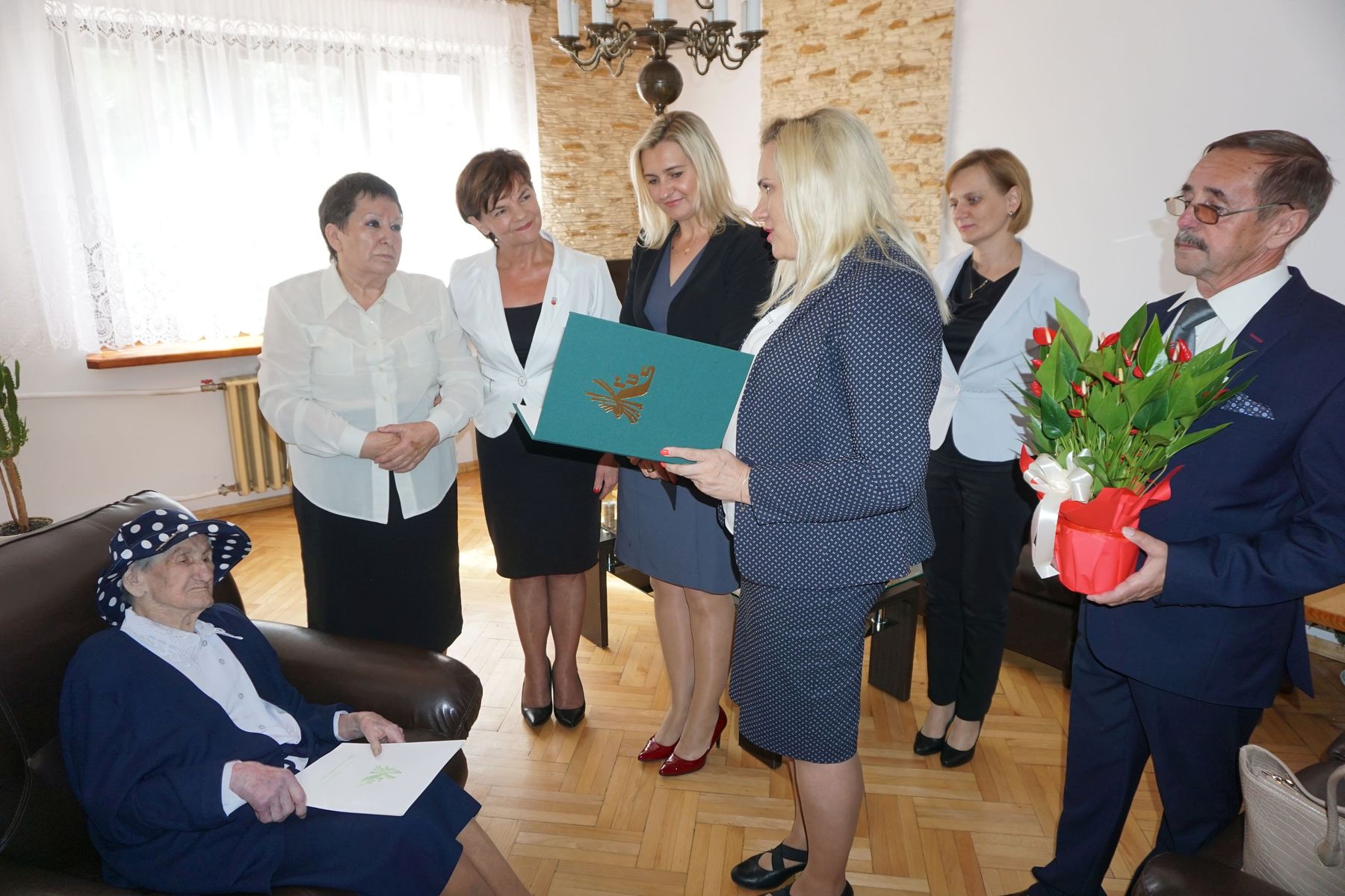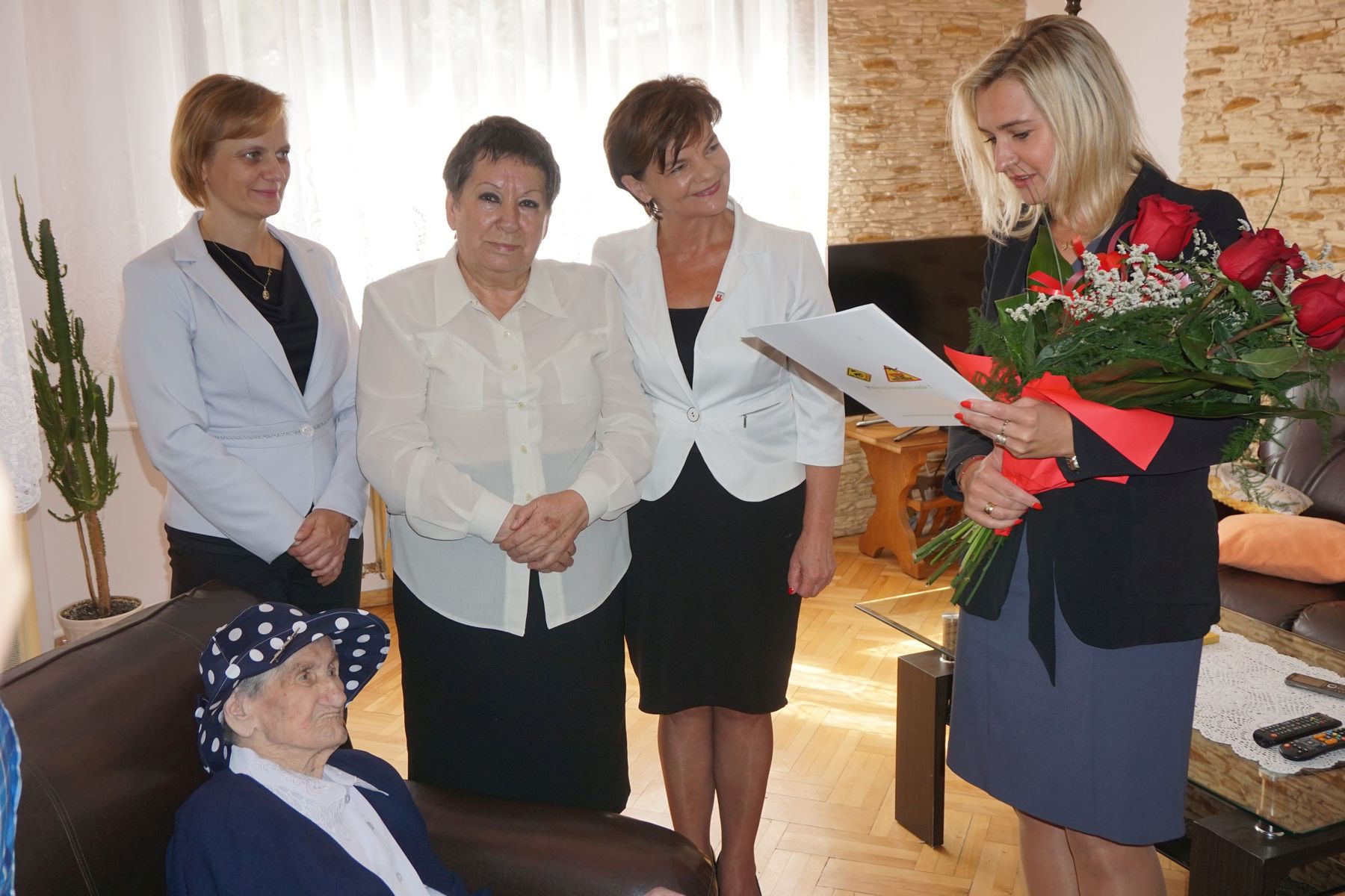 Na ręce Jubilatki Pani Wójt przekazała życzenia, upominek, bukiet róż oraz list gratulacyjny od Prezesa Rady Ministrów Pana Mateusza Morawieckiego. Uśmiechnięta Jubilatka cierpliwie przyjmowała życzenia, serdeczności i naręcza kwiatów. Nie zabrakło też toastu i lampki szampana.