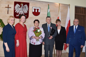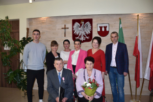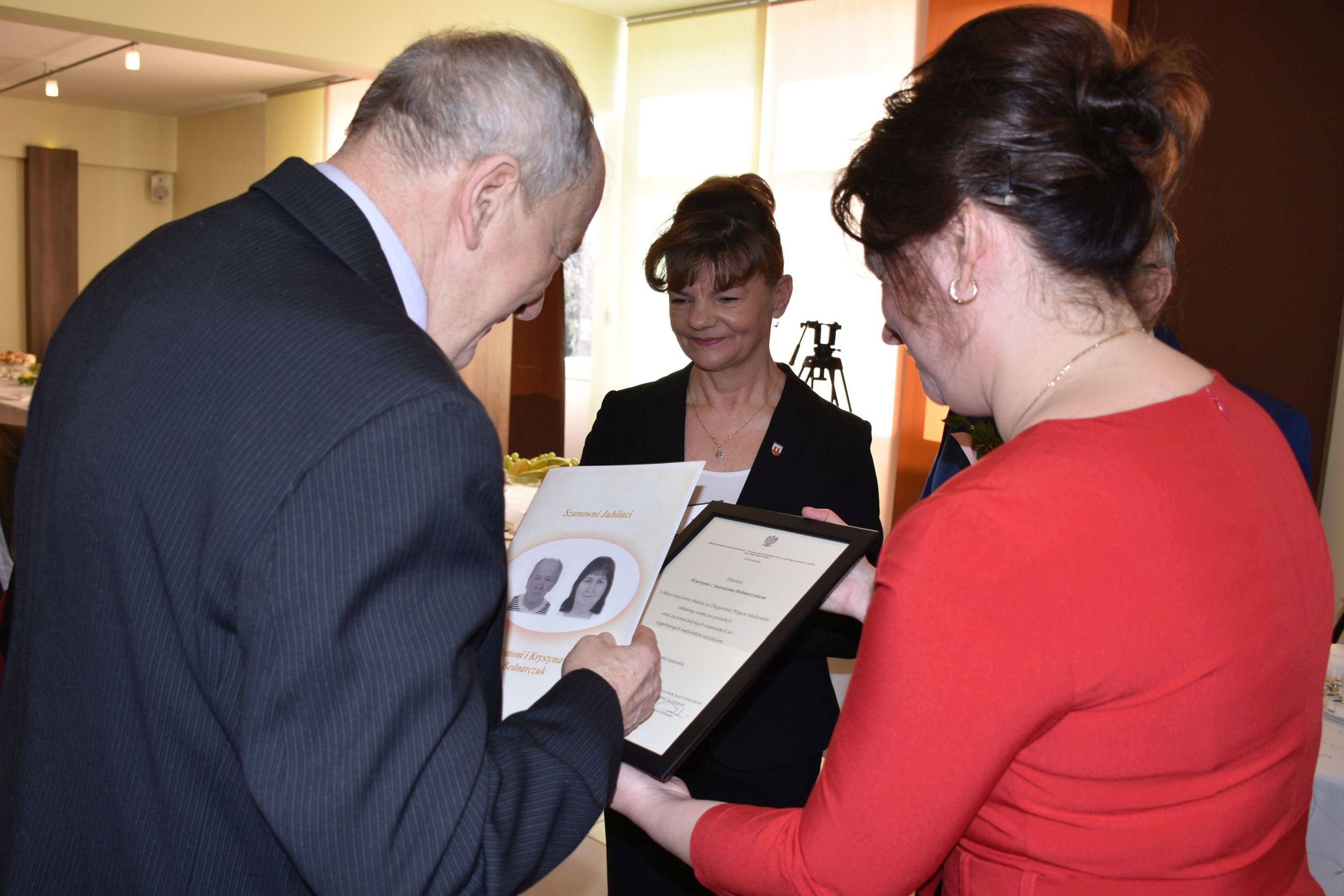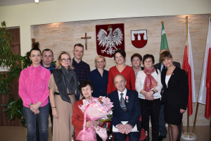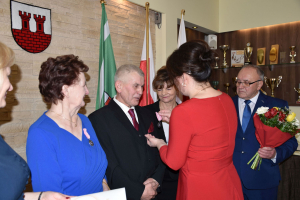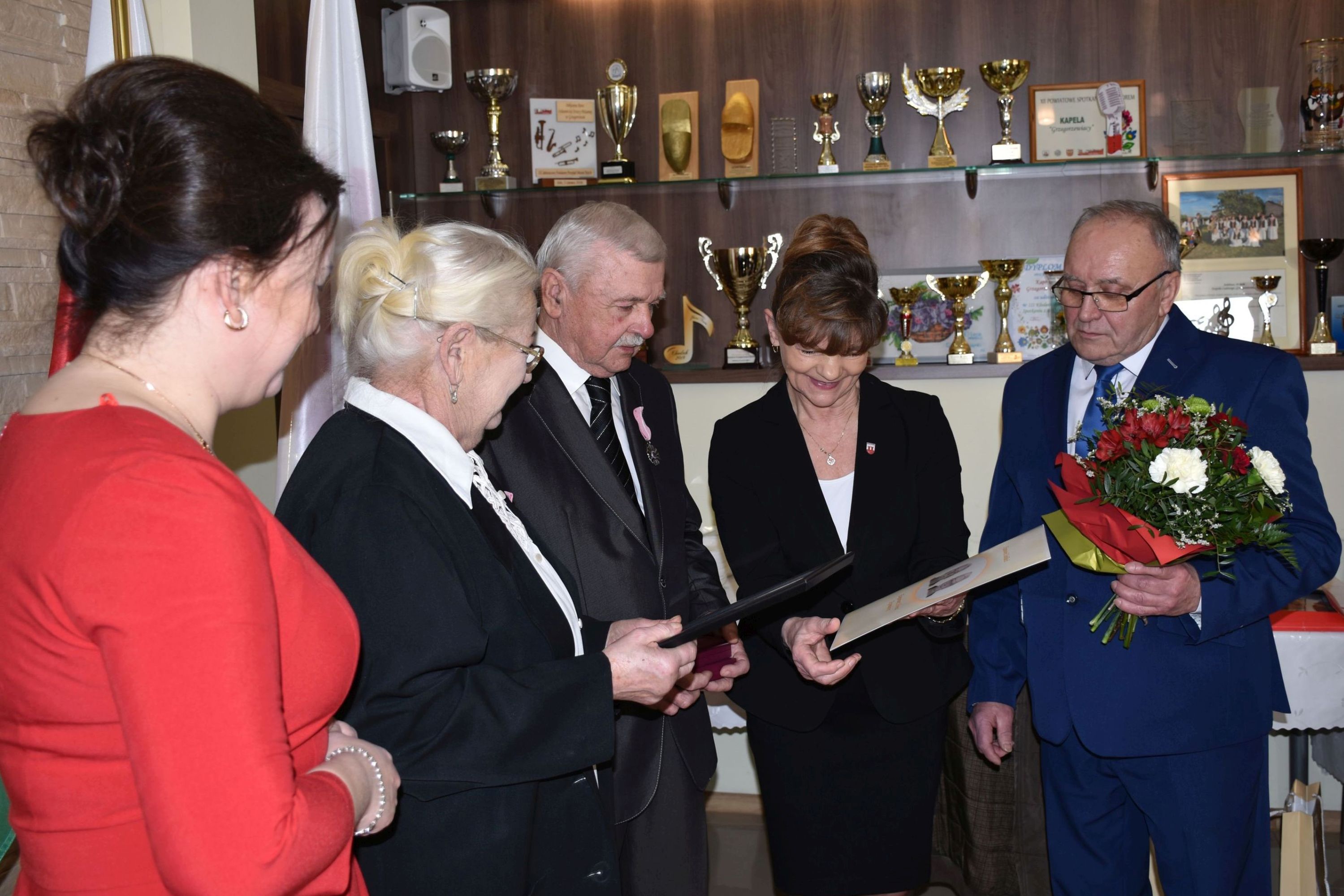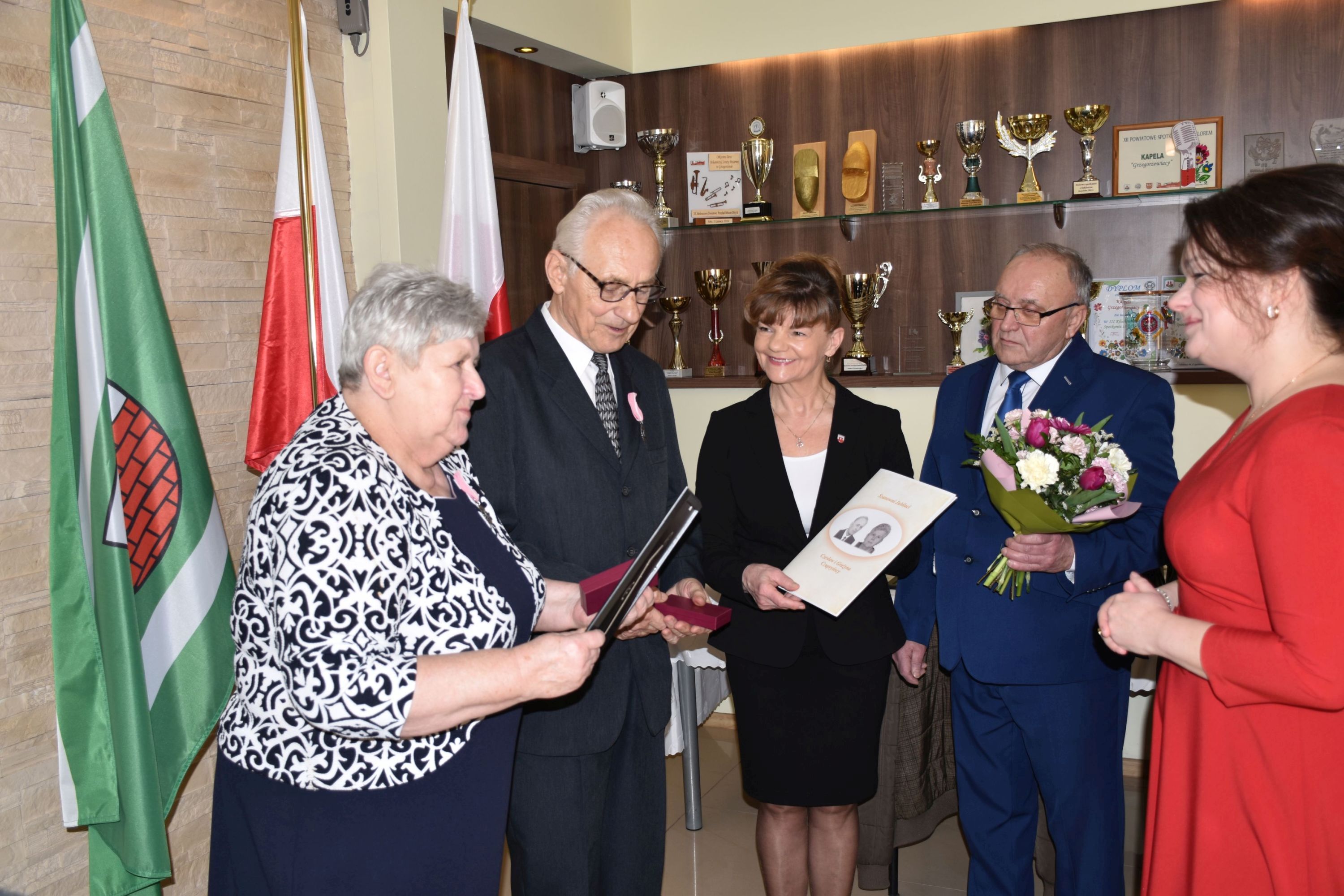 Wójt Gminy Bożena Dominiak wręczyła Szanownym Jubilatom listy gratulacyjne w teczkach okolicznościowych z ich wizerunkami oraz kopie aktów małżeństwa. Zwróciła się do Czcigodnych Jubilatów słowami: