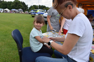 Wśród atrakcji nie mogło zabraknąć Przystanku Biblioteka, gdzie podczas kreatywnych warsztatów prowadzonych przez Panią Agnieszkę Malesza możnabyło wykonać własnoręcznie robioną biżuterię lub przyozdobić swoje ciało brokatowymi tatuażami, które wykonywała Pani Katarzyna Biernacka.