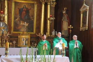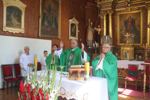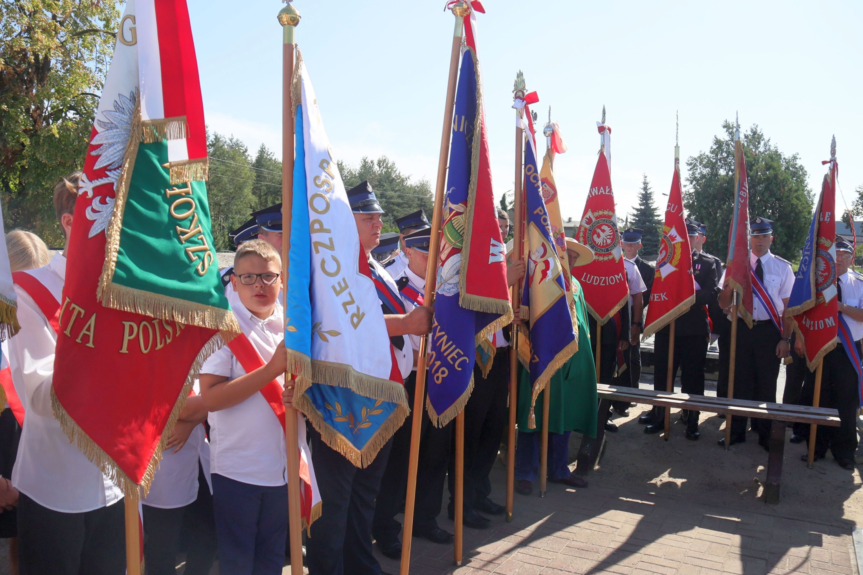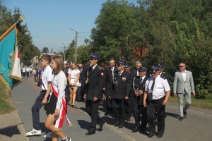 Po zbiórce przed Domem Strażaka samorządowcy, poczty sztandarowe, delegacje jednostek OSP, placówek oświatowych, kół gospodyń wiejskich, zaproszeni goście oraz mieszkańcy gminy na czele z orkiestrą dętą udali się do kościoła parafialnego aby uczestniczyć we Mszy świętej w intencji poległych w obronie naszej ojczyzny. Mszę Świętą odprawił ksiądz proboszcz Tomasz Król w koncelebrze z księdzem prałatem Michałem Pietrzakiem oraz księdzem wikariuszem Bartłomiejem Pyką z parafii Św. Bartłomieja Apostoła w Koninie.