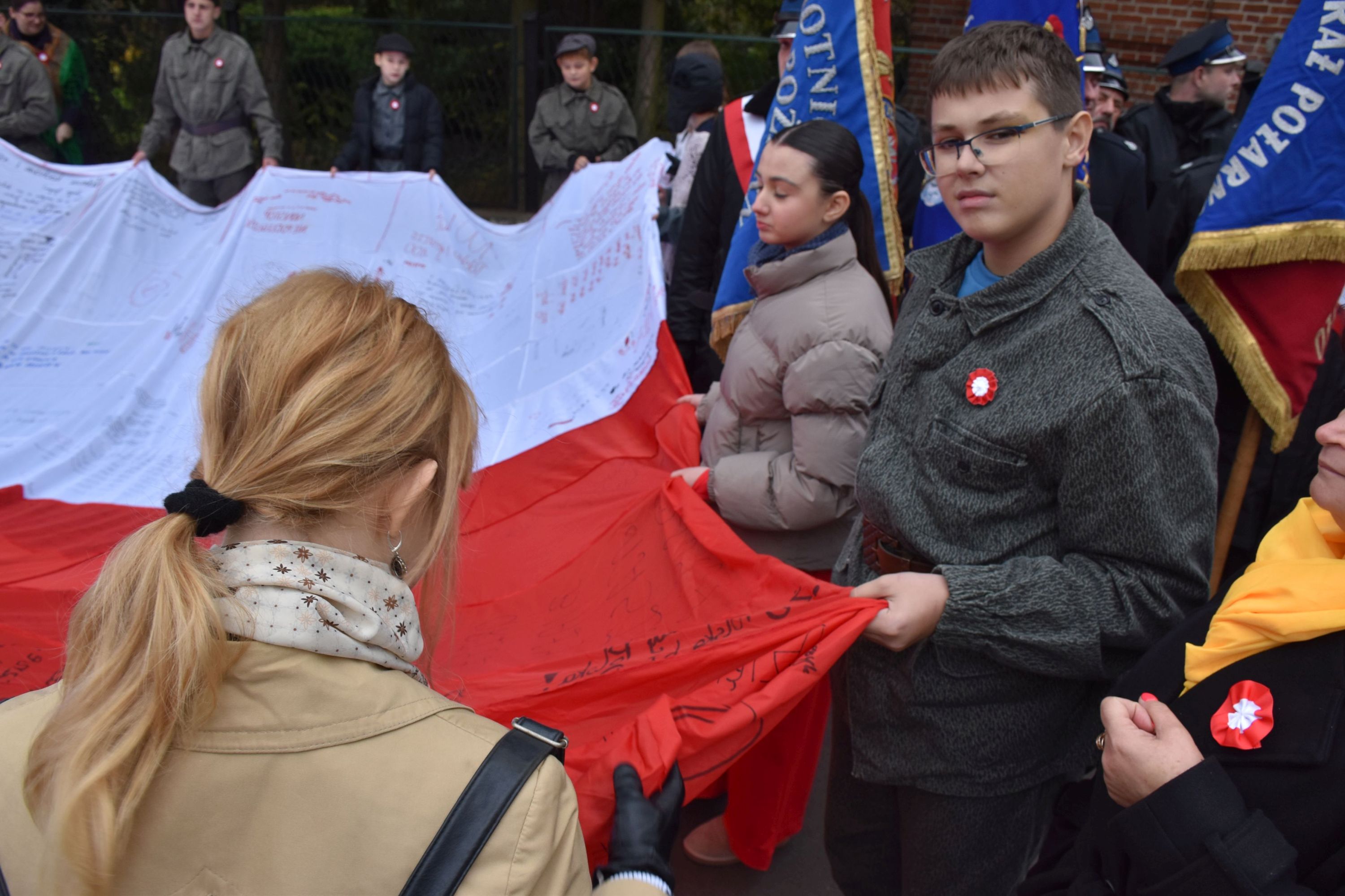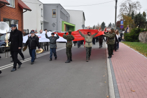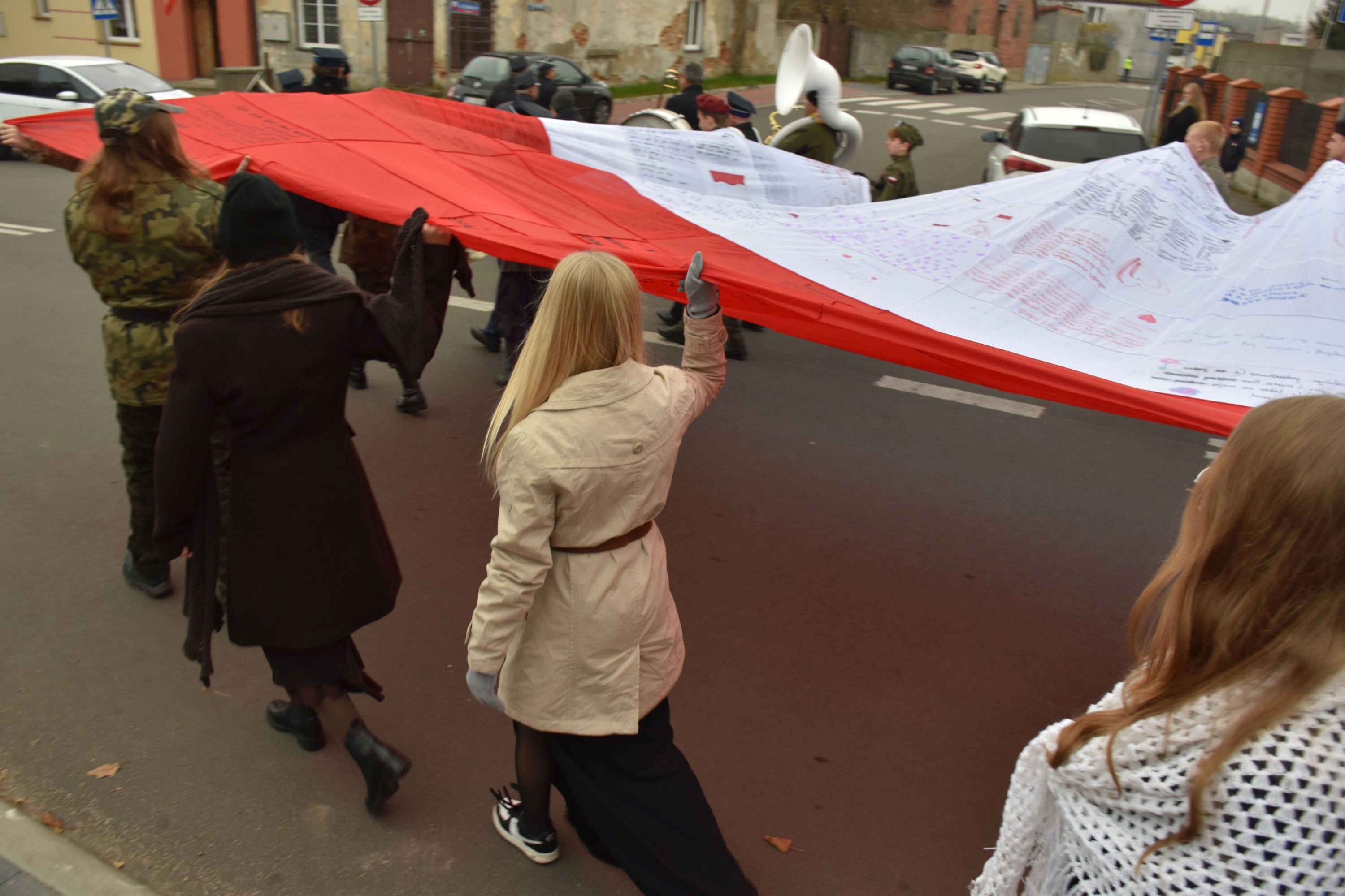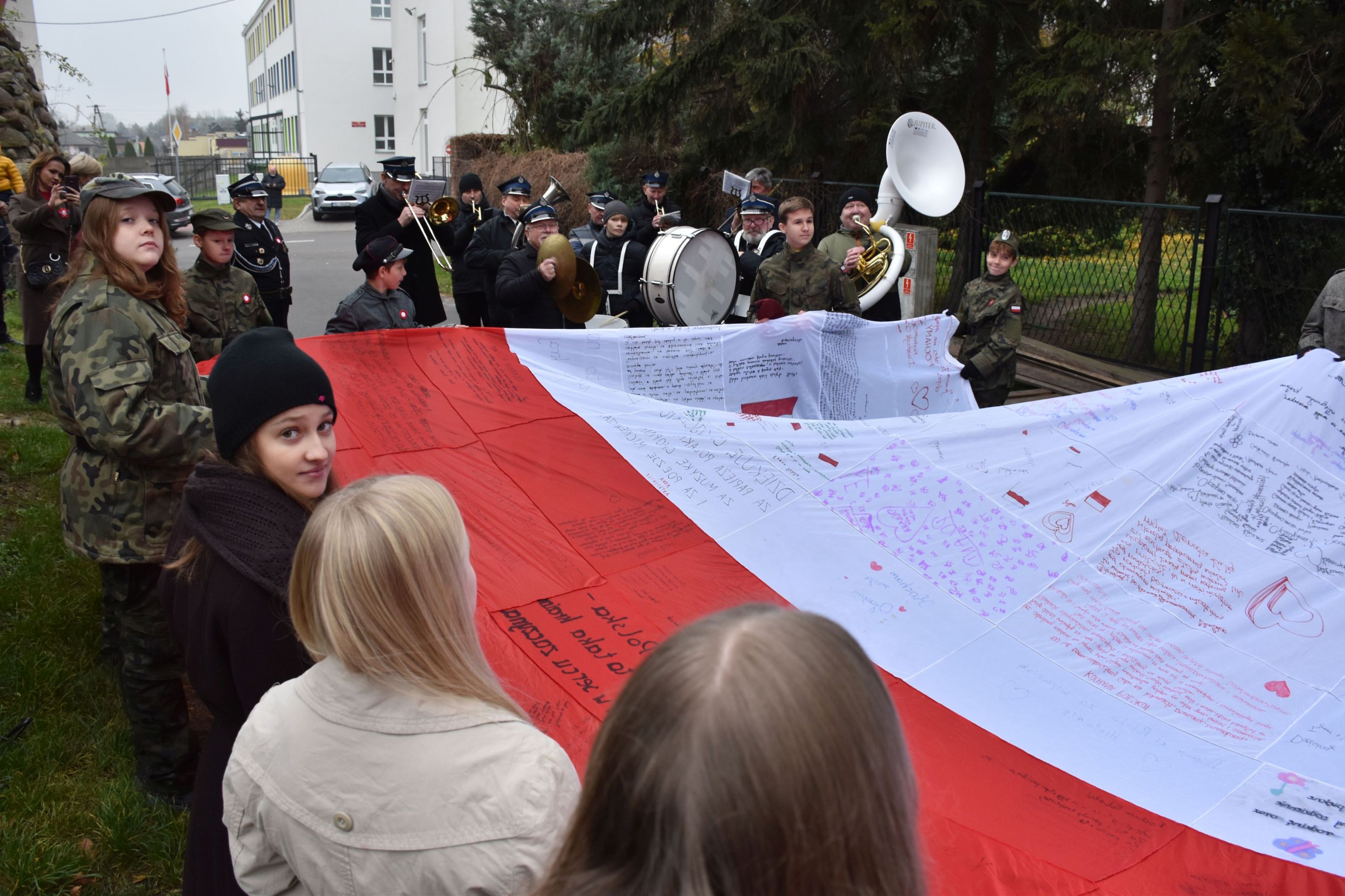Bardzo pięknym akcentem tej uroczystości, który zasługuje na podkreślenie był przemarsz naszego młodego pokolenia z mającą ponad 44 m2 flagą Polski, która została uszyta 6 lat temu na setną rocznicę odzyskania niepodległości. Flaga została uszyta z kawałków materiału, na których mieszkańcy zarówno dorośli jak i dzieci pisali swoje "Listy do Polski".